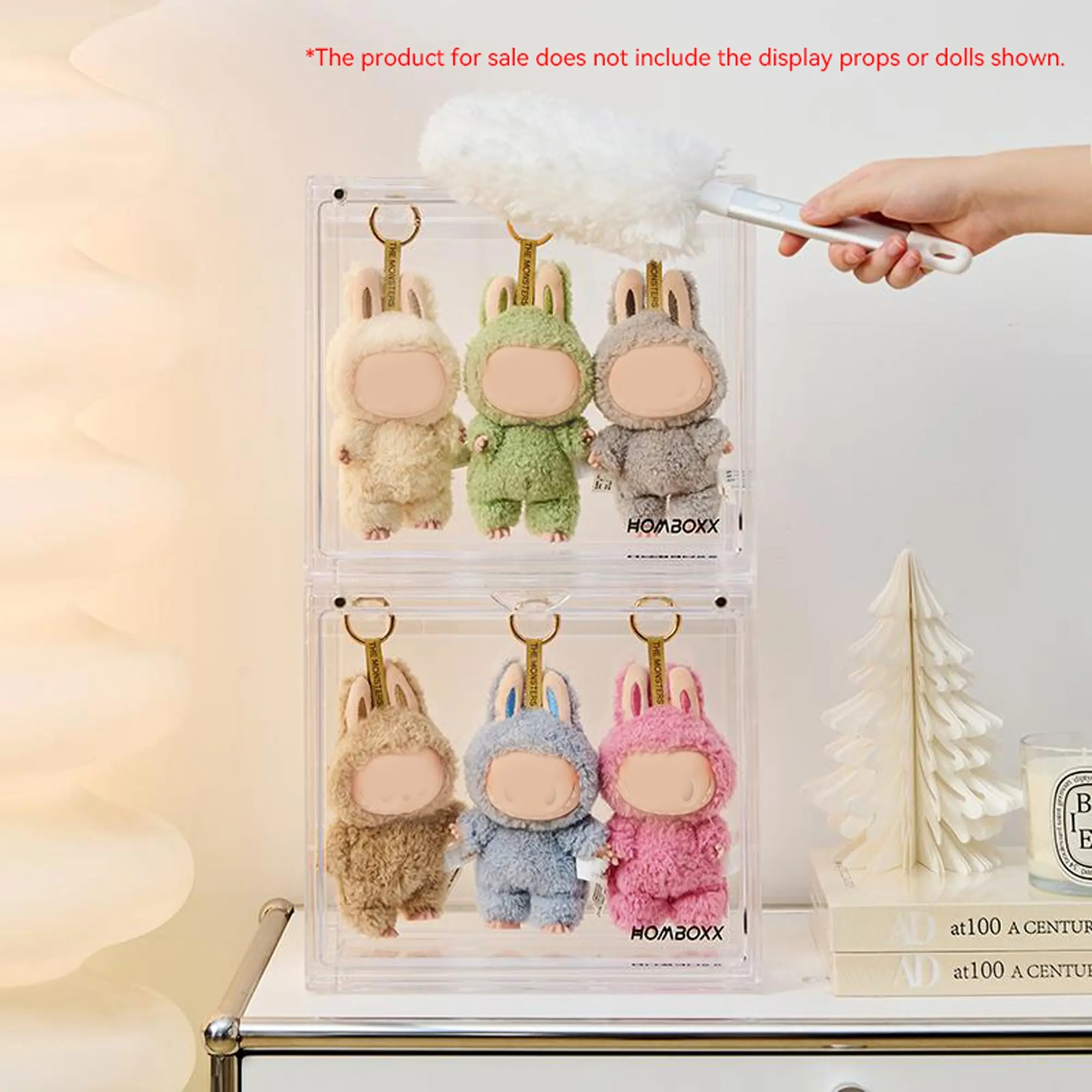 プラッシュキーチェーンディスプレイボックス 4個フック付き、透明・防塵、積み重ね可能な収納ケース、ポップマートプラッシュキーチェーンやフィギュアコレクションに最適、ラブーブ、スカルパンダ、ディムー、ヒロノ、モーリーコレクターに適しています。 #labubu #popmart #skullpanda #dimmo