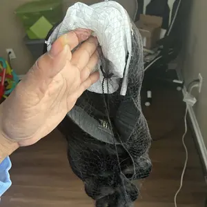 Out of the bag no smell the little aromatherapy packets were a great choice. Very soft human hair. all the free gifts and a satin bag. Didn’t notice any shedding when pulling my fingers through. Actually has the drawstring on the back. I still used glue as it’s more secure for me. Would buy again