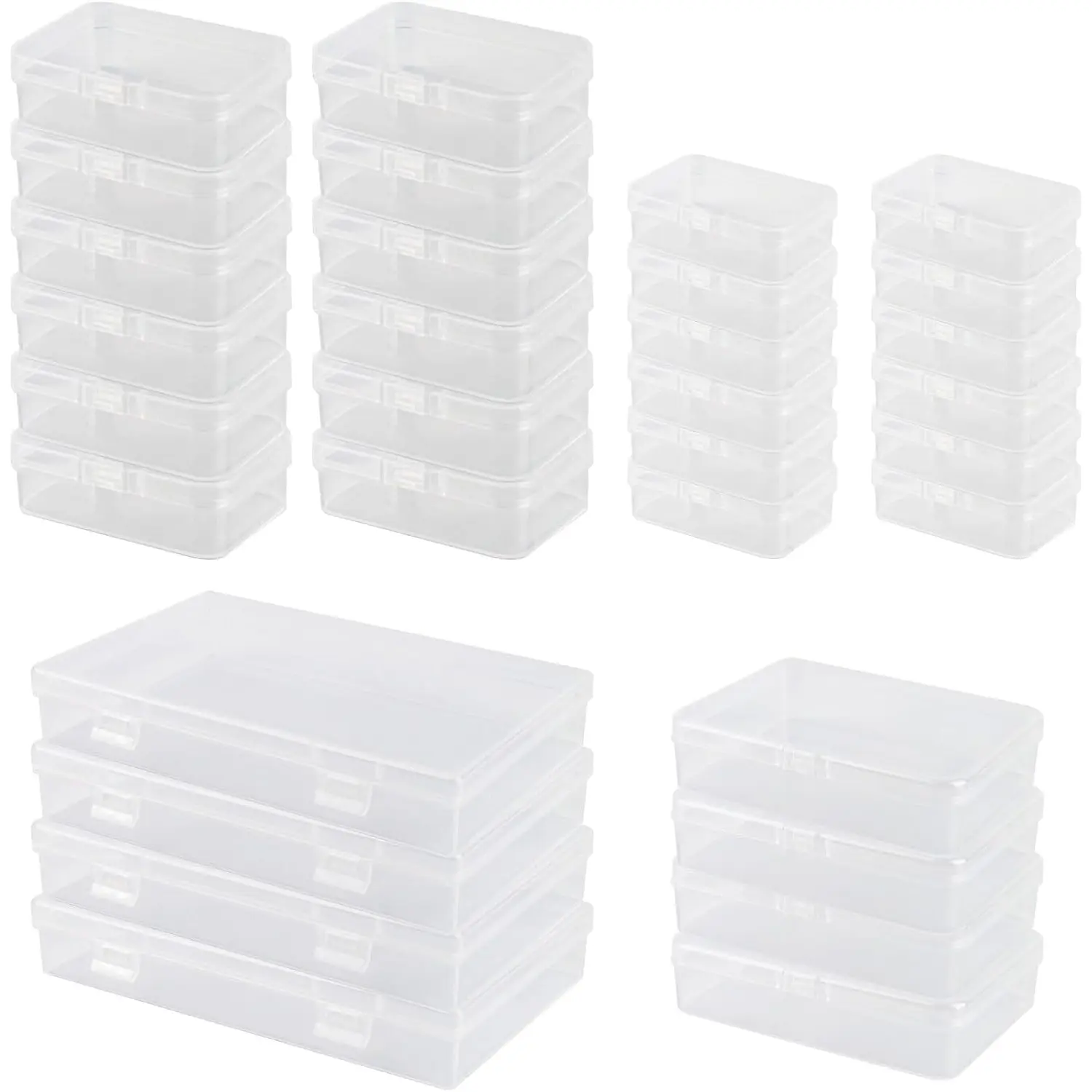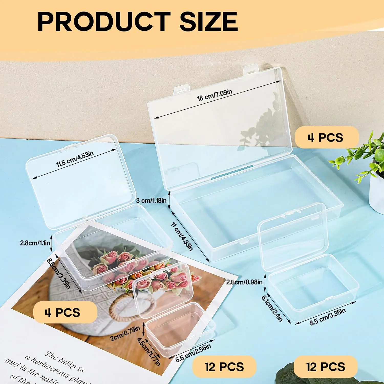 ·Mixed sizes: there are 4 different sizes in our storage box with small lid, 12 pieces 6.5 x 4.5 x 2 cm, 12 pieces 8.5 x 6.1 x 2.5 cm, 4 pieces 11.5 x 8.5 x 2.8 cm and 4 pieces 18 x 11 x 3 cm, the different sizes of the storage box are able to store different items and help you classify