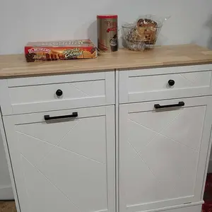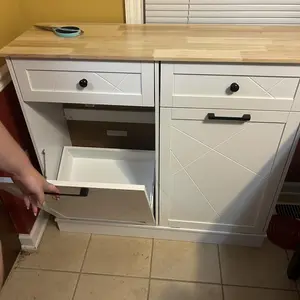 Kitchen Cutting Board Table Top: This is a fully upgraded kitchen trash bin cabinet. The material of the table top has been replaced with rubber wood solid wood, which can be used as a chopping board. It can cut vegetables, fruit, and doing various dishes on it. It is waterproof and moisture-proof, easy to clean, clean and sanitary, making your life more convenient.
