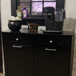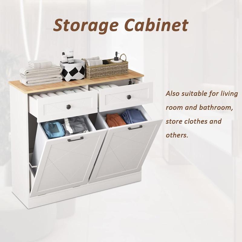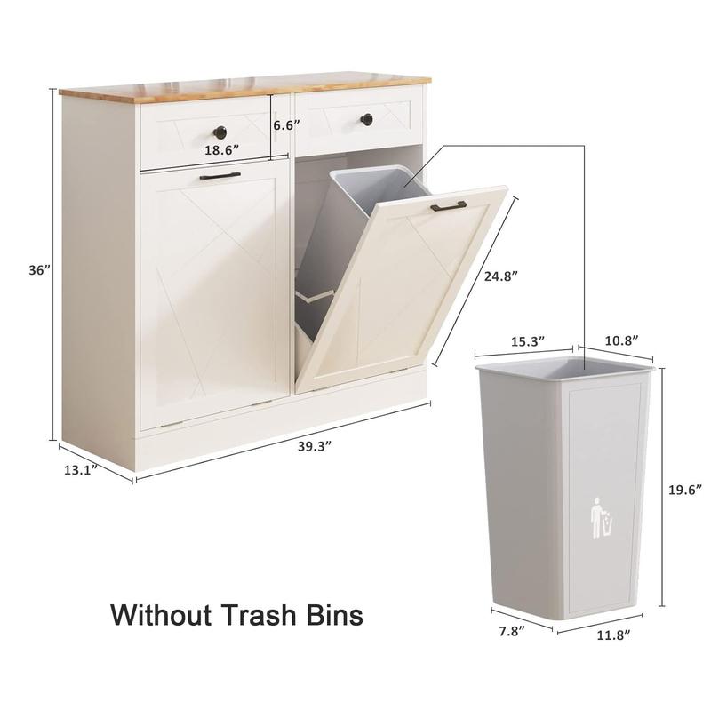 More Storage Space: As a double-door garbage can storage cabinet, it can hold two 10-gallon garbage cans, and there are two drawers on it to store sundries. The table top is also an additional space, which can be used to store items. The overall size is 39.3 * 13.1 * 36 inches, not including garbage cans.