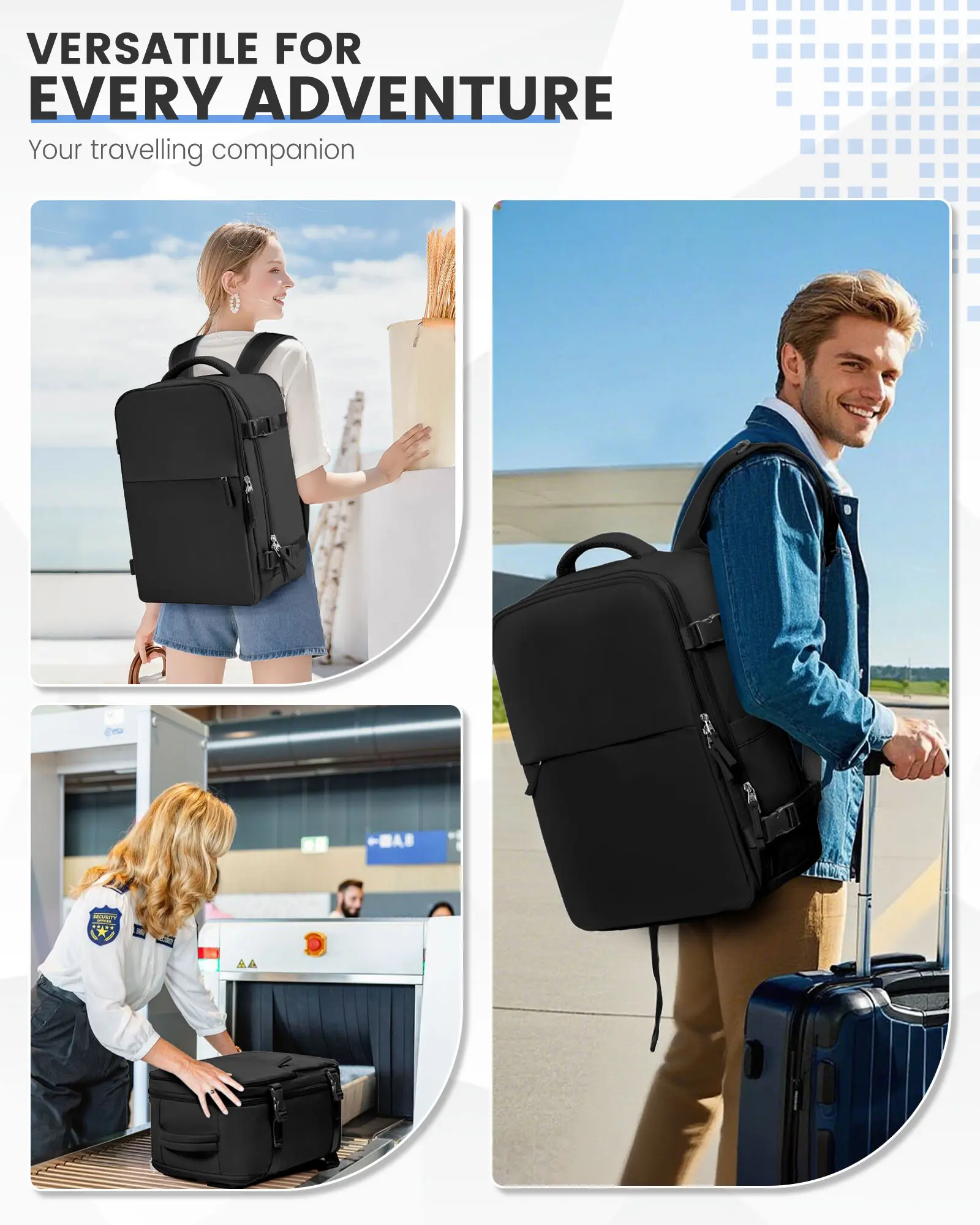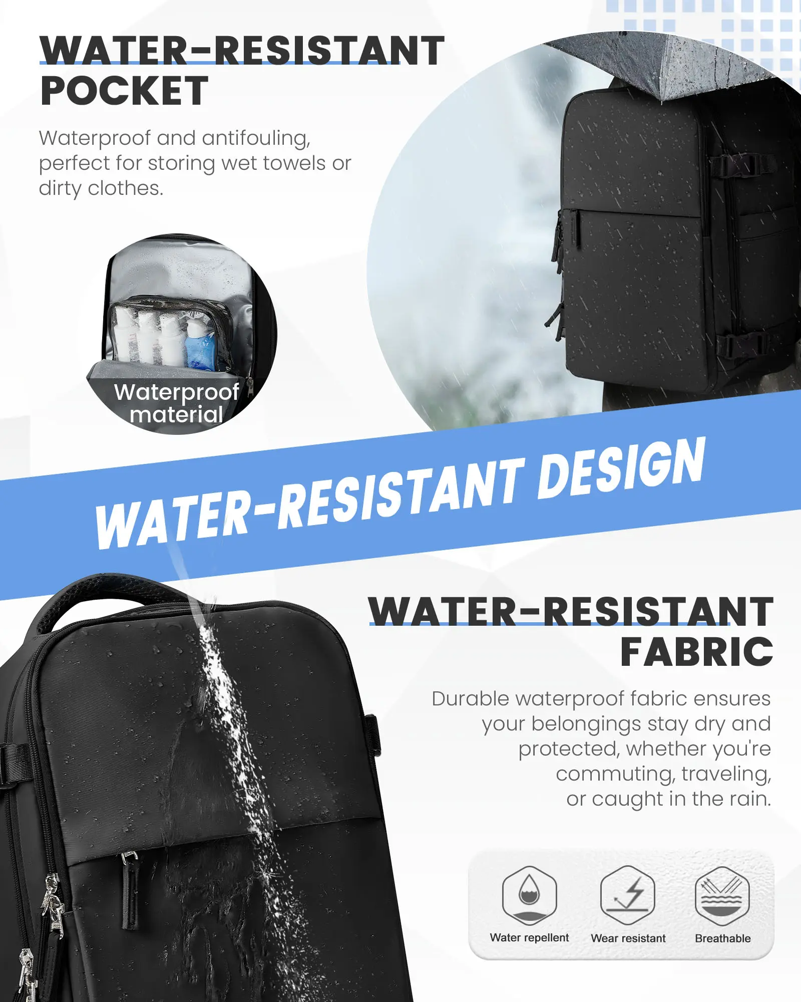 ·【Wet/Dry Separation Compartment】The front pocket of the flight-approved travel backpack is made of high-density material and helps you separate dry items from wet clothes or towels.