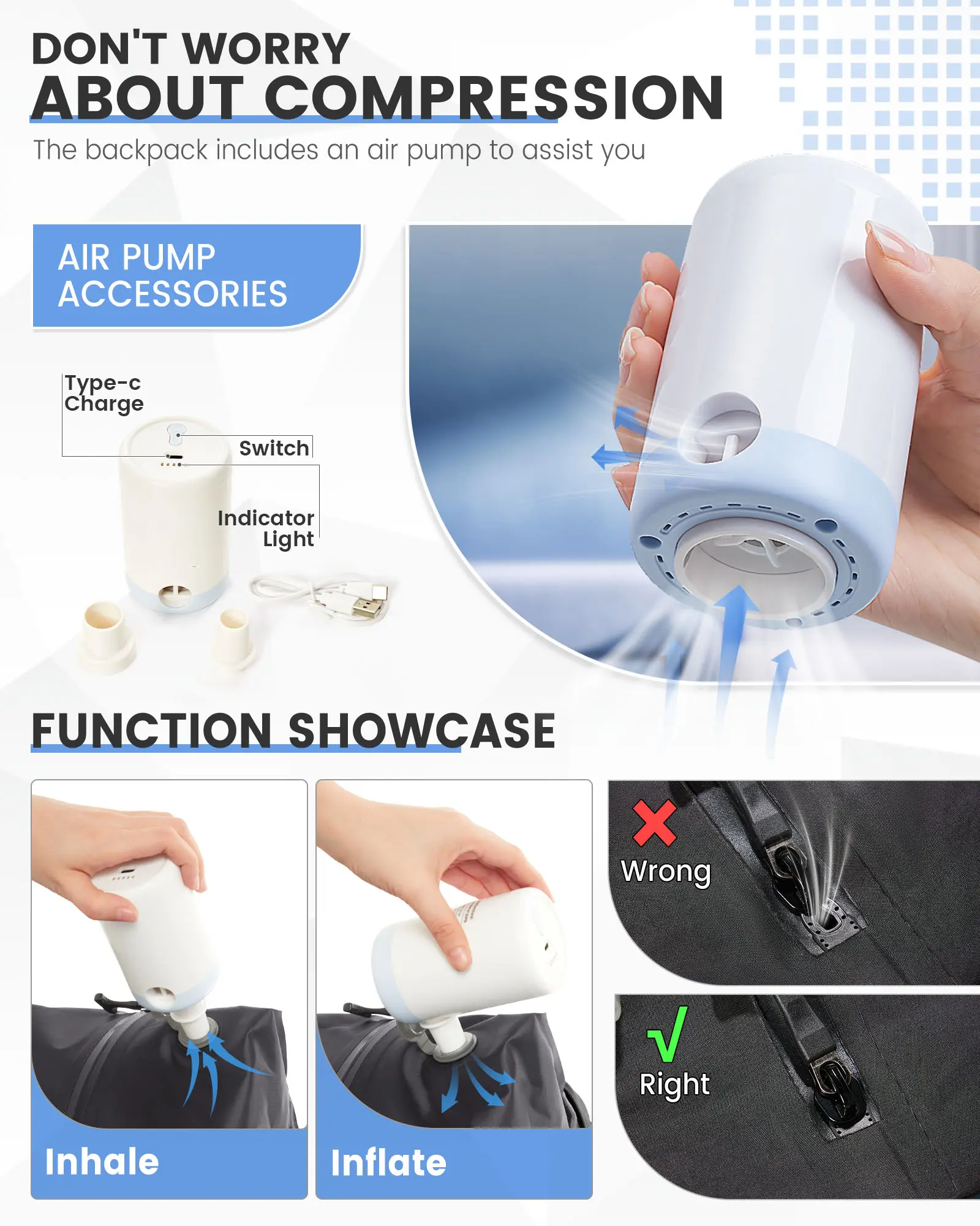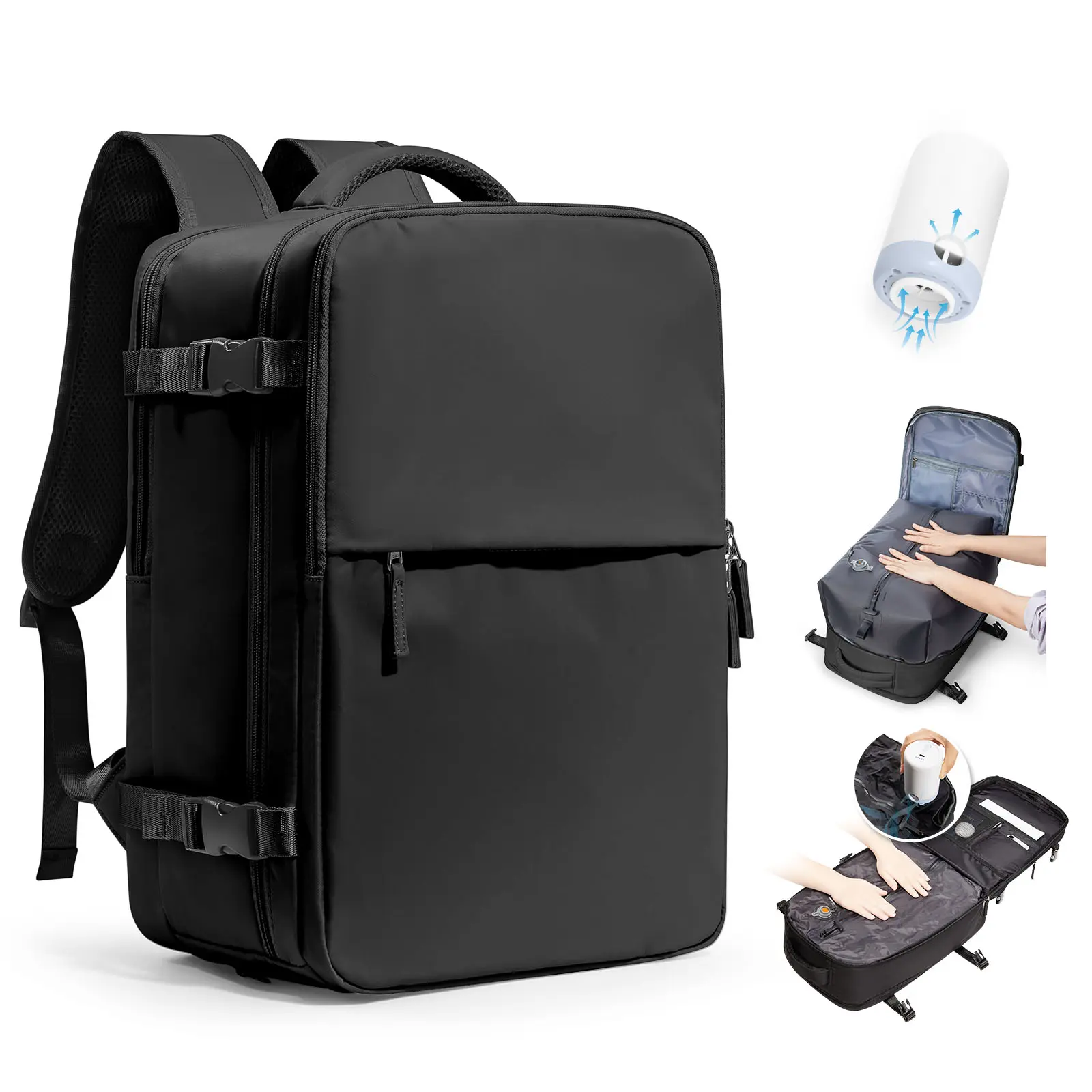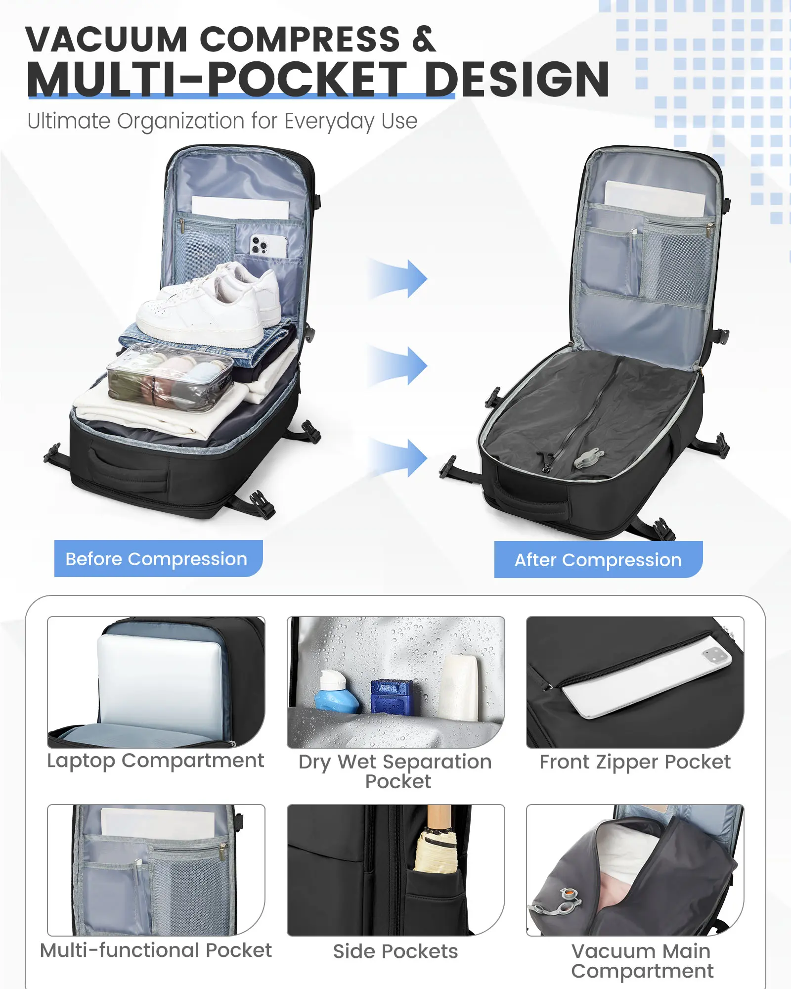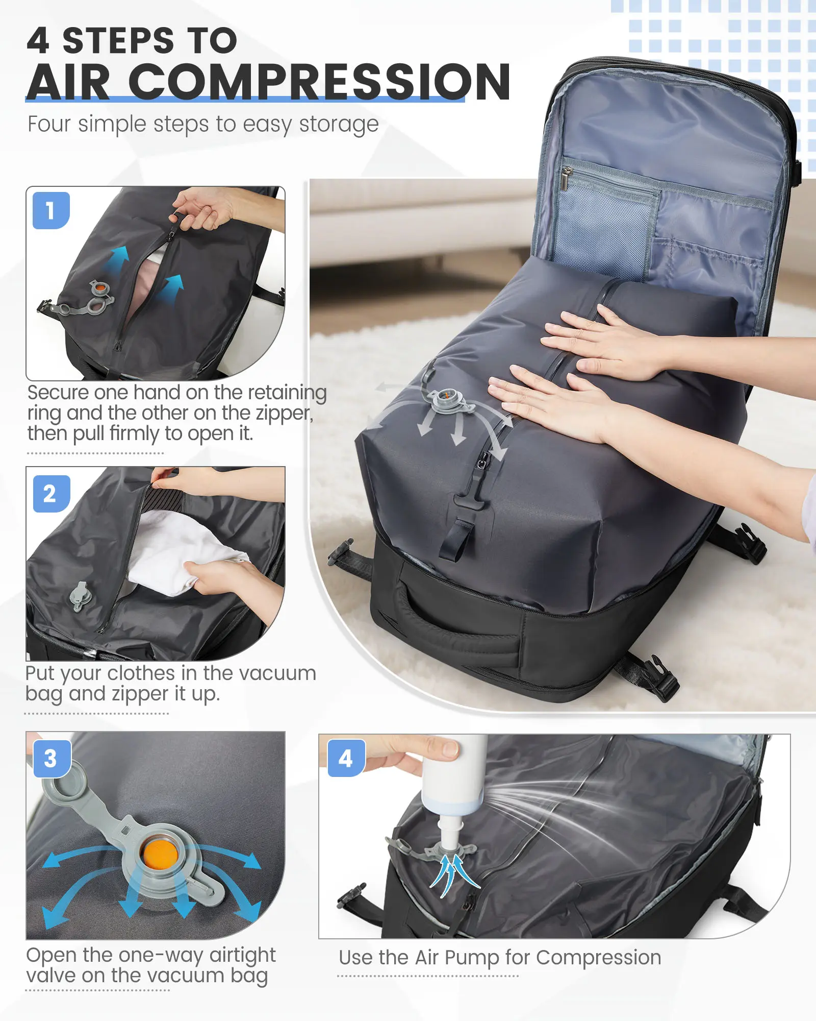 ·【Vacuum Compression Bag】 There is a vacuum compression bag inside the largest compartment of the backpack, you can put the clothes into the vacuum bag, tighten the zipper, open the one-way exhaust valve, through the pump for compression, to reduce the items take up the volume, load more things. Please note that the zipper used in the vacuum bag requires more force to pull, this is to ensure that the vacuum airtight, not zipper damage is not smooth.