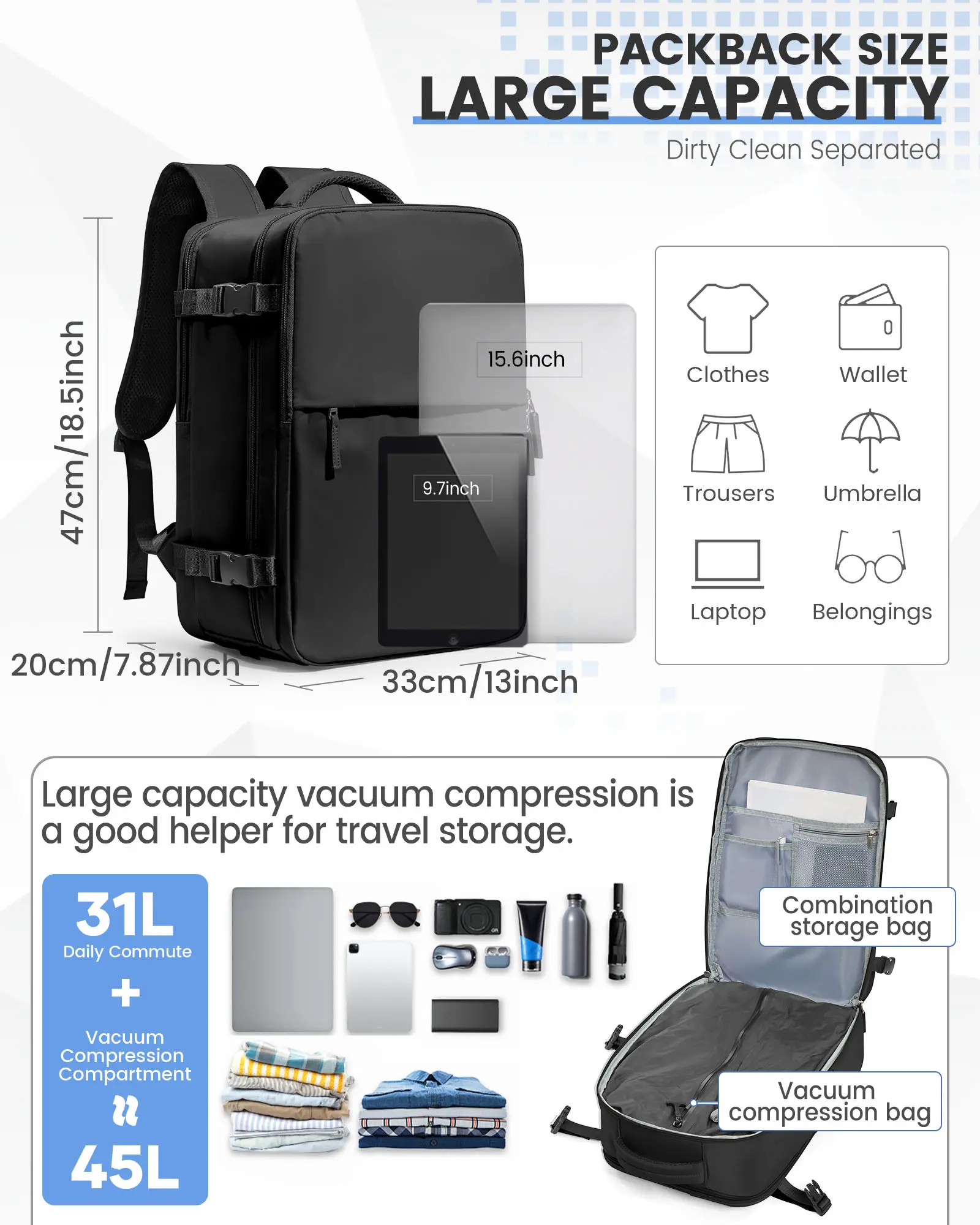 ·【Large Capacity Multifunctional Backpack】 The Travel work backpack size is 47*33*20CM/18.5*12.99*7.87inch (Manual measurement may have error, no more than 3cm). The main pocket can hold 2-3 days of clothes. The front compartment with various pockets can be used to store notebooks, pens, headphones and other small items for quick picking. This travel bag has a laptop compartment that fits most 15.6 inch laptops.