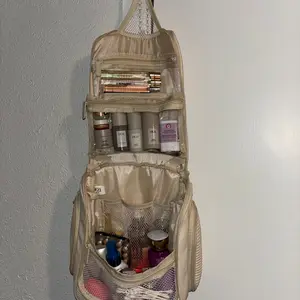Versatile, fits all ur makeup and sum more stuff! Two extra side zippered pockets on each side. Inside has body space three netted pockets on the back side and one small netted zippered pocket in front. The opening flap has two extra pockets and a hook for hanging and folding out. So if that’s not enough compartments size down ur stuff haha jk you get the point plenty room for organizing and fits a little of everything.