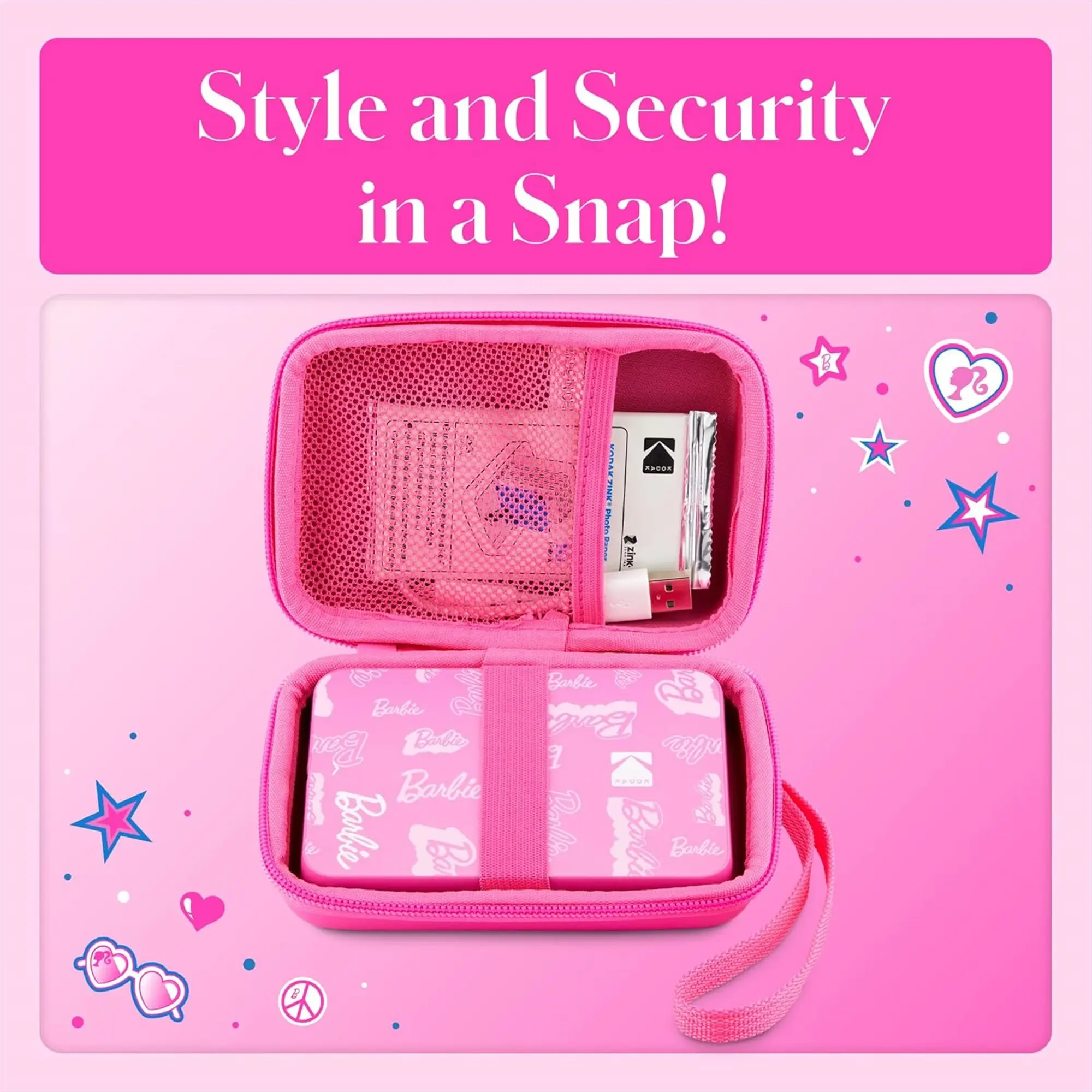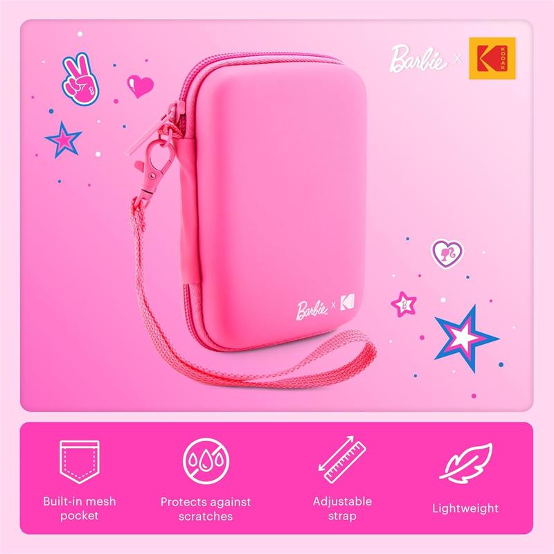 Ever worry about your Barbie x Kodak printer or camera getting scratched or left behind during your adventures? Meet the Barbie x Kodak EVA Travel Case—a stylish, lightweight solution that keeps your favorite photo device safe and ready to snap. This radiant pink case is tailored for your Barbie x Kodak Printomatic or Step Slim, offering a snug, protective fit that guards against everyday bumps and scratches. Inside, a built-in mesh pocket neatly stores your Zink paper, charger, and other small essentials, so you’re always organized on the go. The removable strap gives you versatile carrying options—wear it crossbody or tuck it away when you don’t need it. Whether you’re heading to a party, vacation, or just a day out, this case adds a fun pop of color while keeping your gear secure. Included in the box is the EVA travel case with removable strap and mesh pocket storage. Ready to travel in style and keep your memories safe? Grab your Barbie x Kodak EVA Travel Case today and let the good times roll!