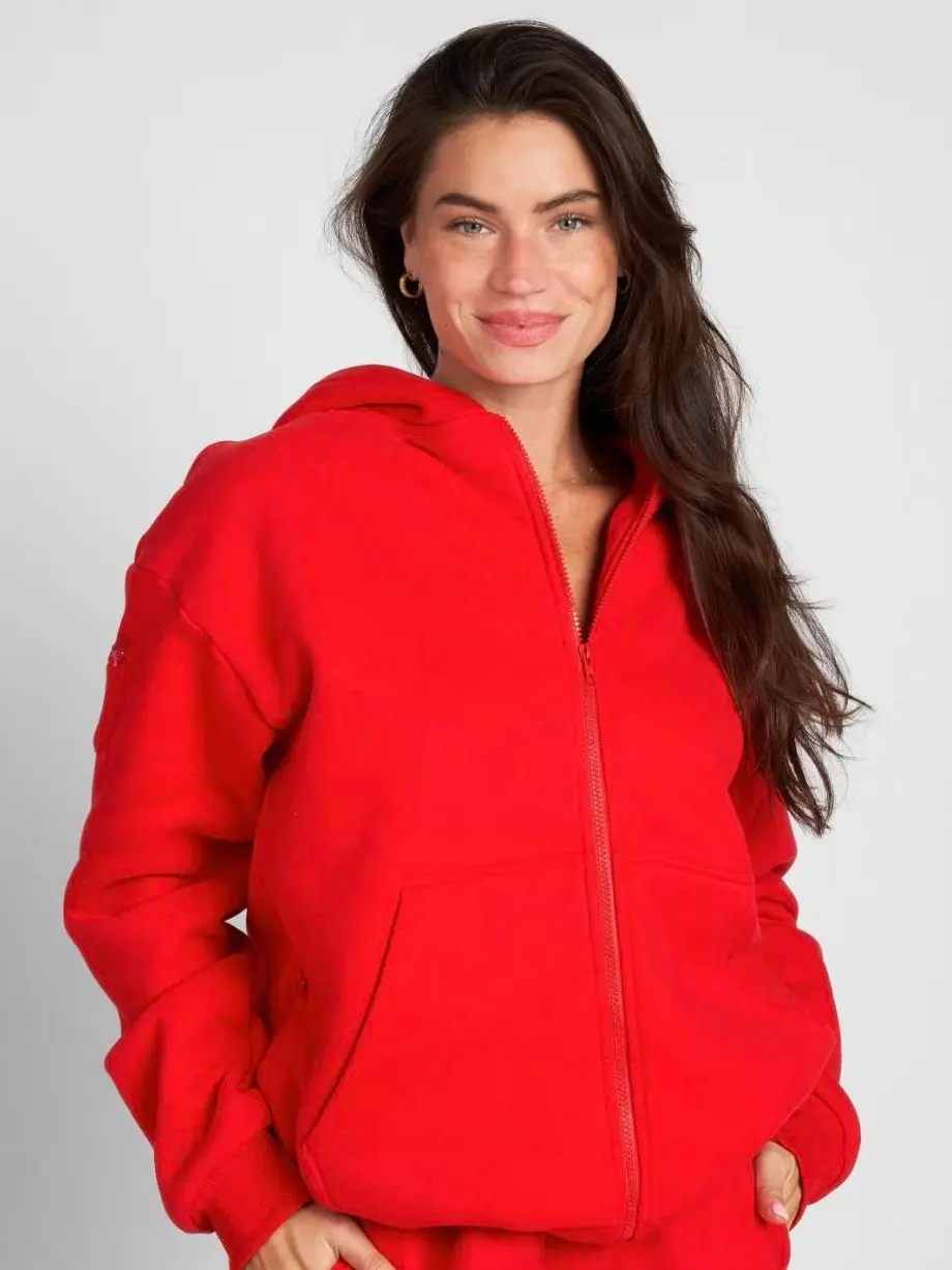 Love Love Love! This full zip is perfect for travel, I love all the zipper pockets, nothing falls out! The quality it top notch! Runs big as expected for comfort! I bought the matching joggers too!