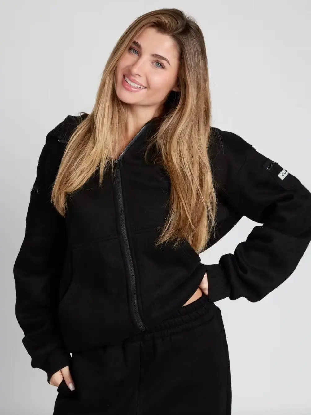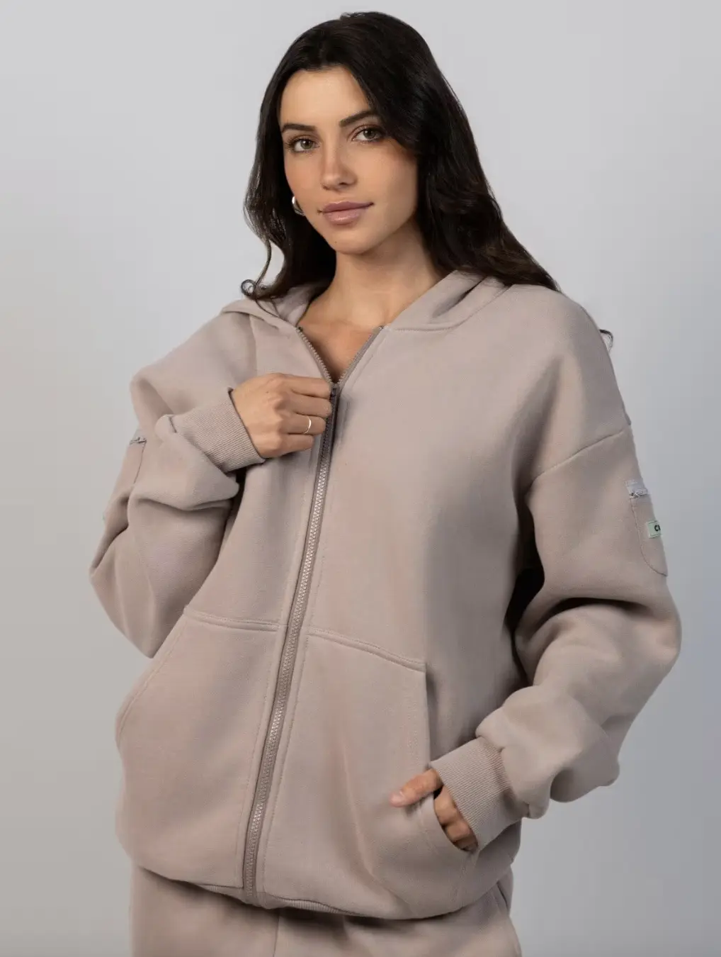 Love the fit! This is the 4th hoodie I order but first zip-up. Logo is on the small arm pocket only. Has so many pockets to keep your things. Highly recommend if you travel or are active and don’t want to carry a bag.