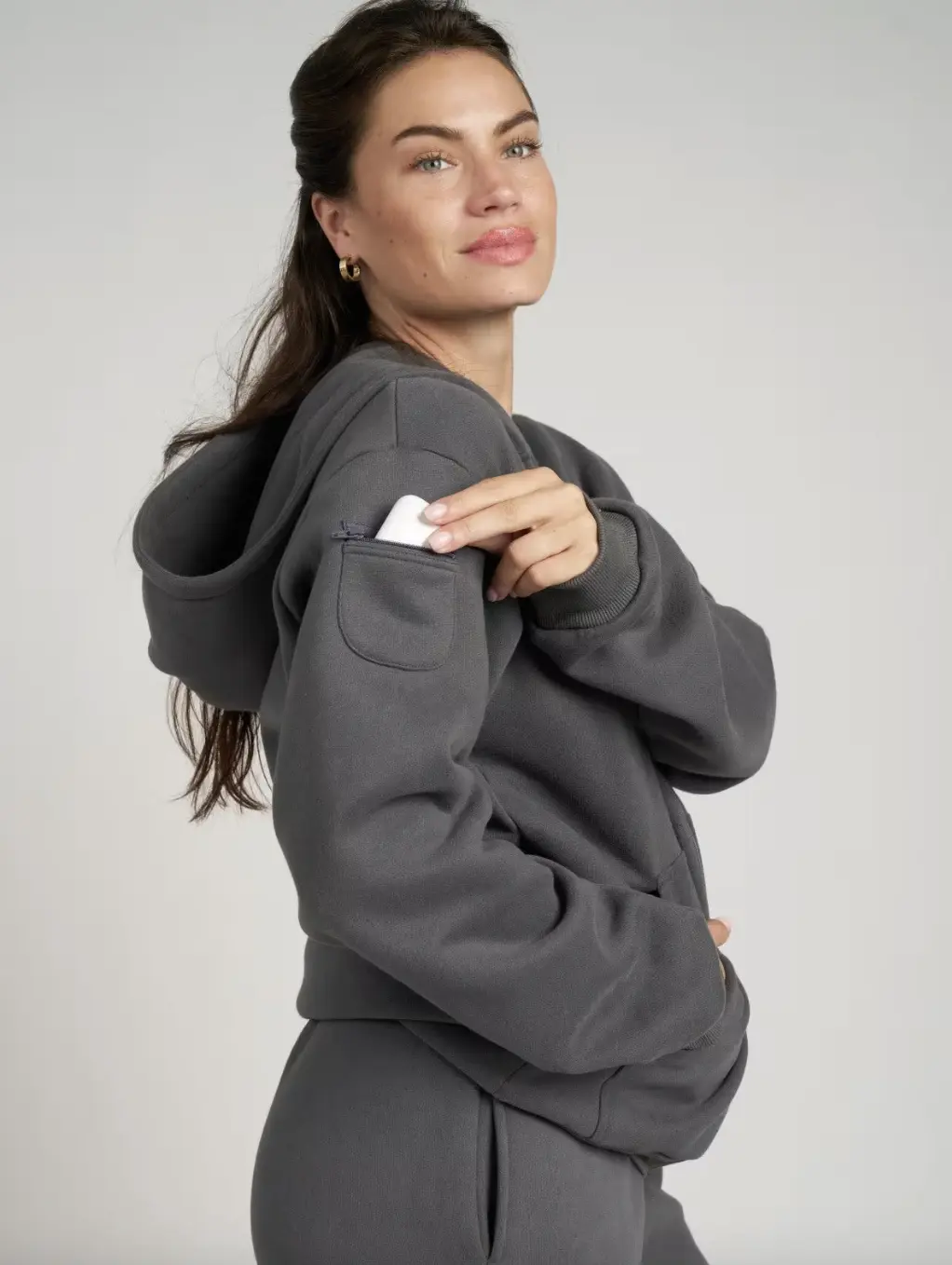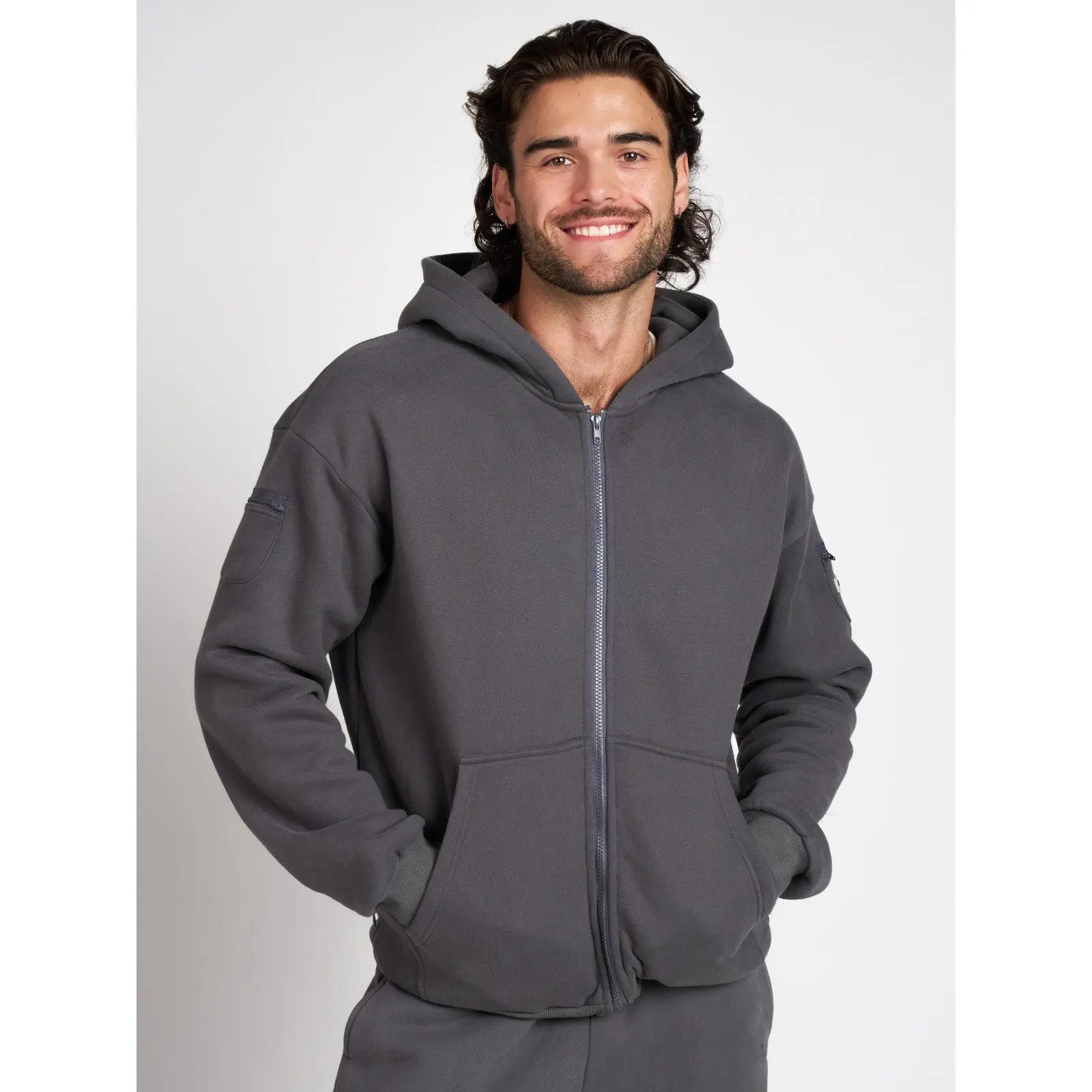 This zip hoodie is so soft and warm! It has several pockets, two on the sleeves and zipped pockets inside the hand pockets as well. It's very nice and convenient for on the go when you don't want to carry anything with you like a handbag.