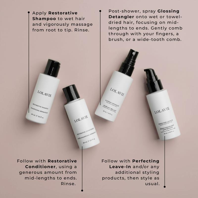 Naturally-derived, plant-based ingredients in advanced formulations designed to promote healthier-looking hair for all types and textures. Formulated with LolaVie Bond Technology – a truly proactive approach to repairing the look of existing damage while protecting from future damage by harnessing the power of chia seeds. Cleanse, hydrate and fortify scalp and hair with our Restorative Shampoo and Conditioner. Prime and protect with our best-selling, award-winning Glossing Detangler and Perfecting Leave-In for silkier, shinier, healthier-looking hair.