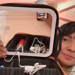 Me encanta el color, el tamaño, las divisiones y tiene el espacio exacto para lo necesario de viaje. El espejo esta perfecto, con su cable para recagar. Y la parte para poner las brochas
