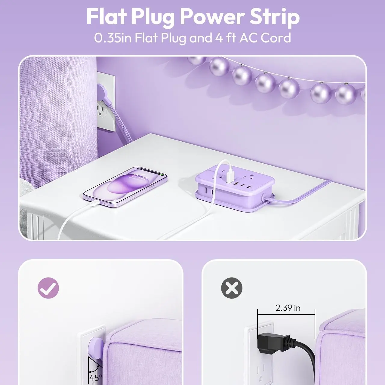 ·Flat Wall Plug: Ultra-flat design (0.35in thickness) for maximum space savings.
