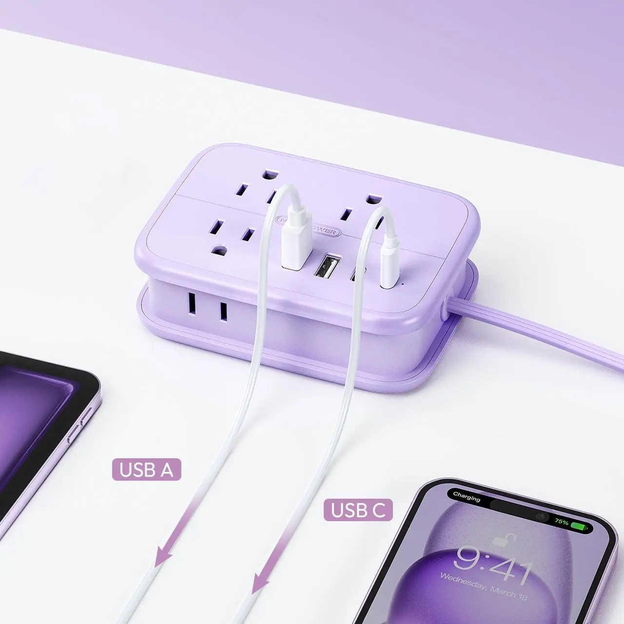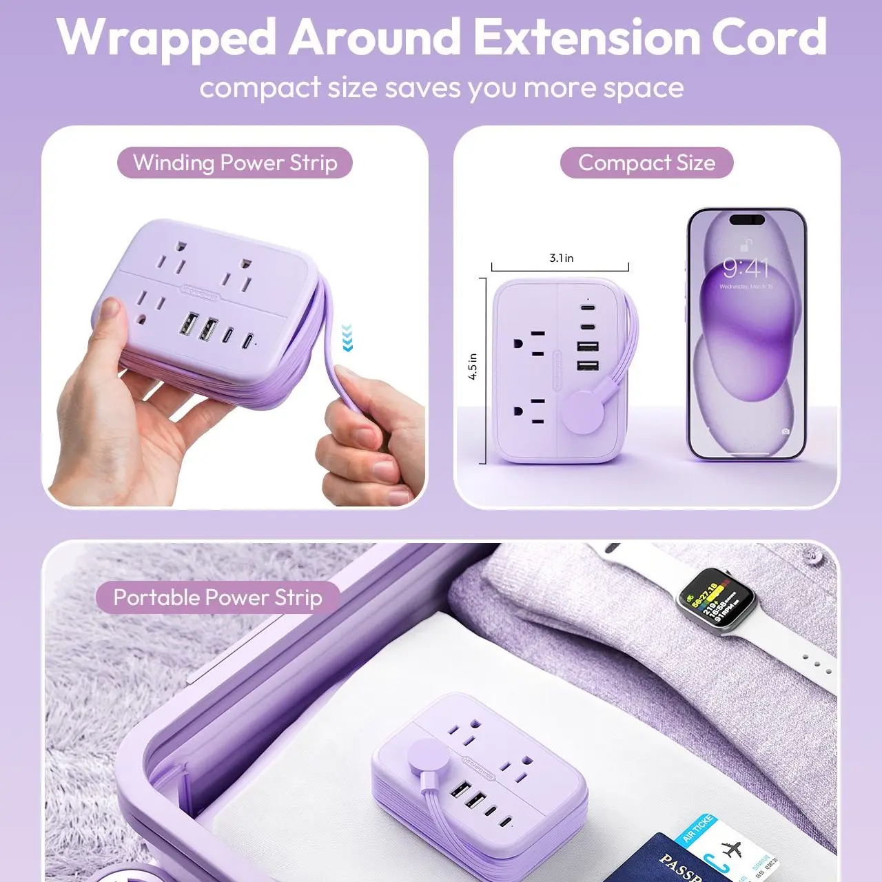 ·4 USB Ports: Includes 2 USB-C ports (15.5W/3.1A) and 2 USB-A ports (12W/2.4A).