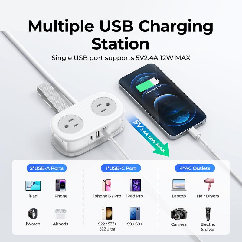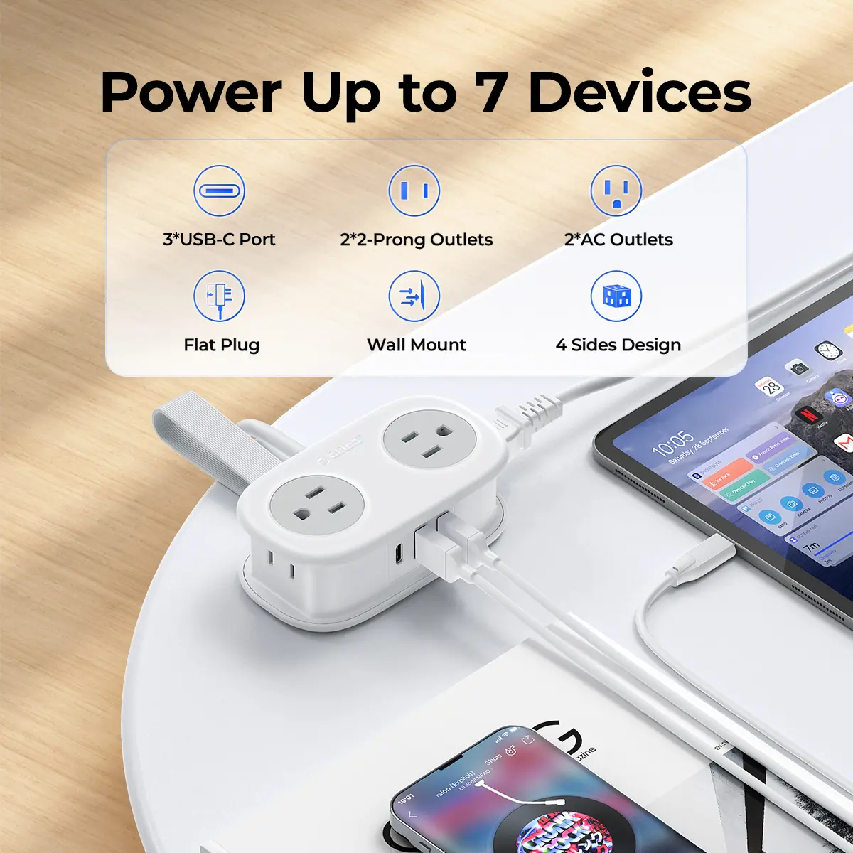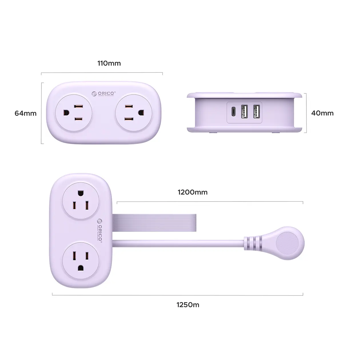 Flat extension cord boasts 4 AC outlets and 3 USB A Ports. ORICO power strip can charge up to 7devices at the same time, so you don’t have to worry about not having enough sockets.