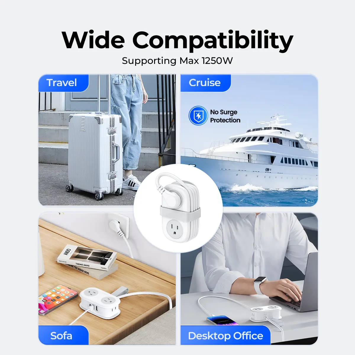 Cruise ship approved power strip and has no surge protection features, making it ideal for travel. Whether you're on vacation, in a hotel, or on a cruise, you'll be able to stay connected with this portable power source.