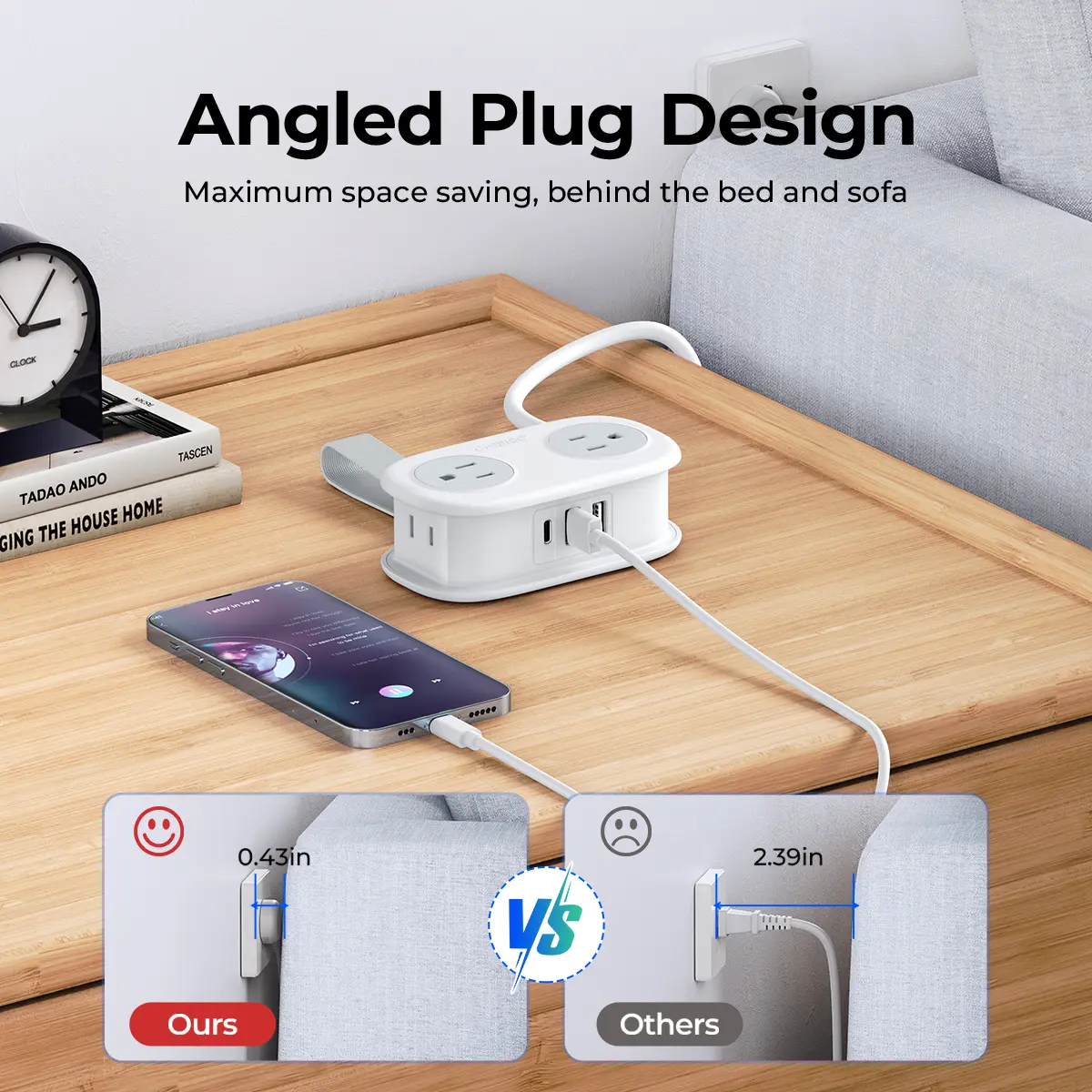 With 0.39-inch thin flat plug and 45° right-angle design, the outlet extender can be easily installed in narrow places, such as behind furniture, sofa, bed, TV cabinet or bedside table. It also doesn't block the bottom socket of a double wall outlet and frees up the socket for other uses. Save space to the greatest extent and no sockets will be wasted.