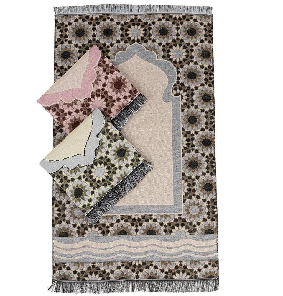 Featuring an Islamic geometric star pattern, this very thin and cotton prayer mat is folds up small and is perfect to travel with. This is one of our thinnest and lightest prayer mats, and can easily fit in a purse, desk drawer, or in your car's glove box so you can always have it with you!