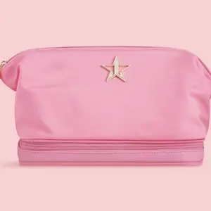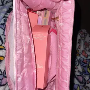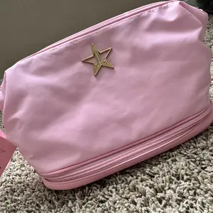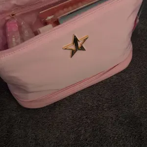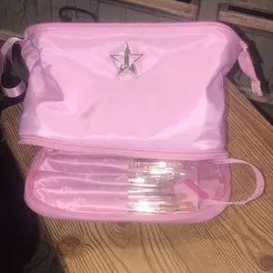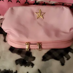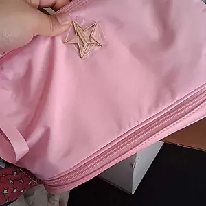 Omg I love this makeup bag. Such a pretty pink I love pink everything I have is pink also wet to clean off if needed. Thank u jeffree star and his team very much appreciated. I got this on a Bogo sell