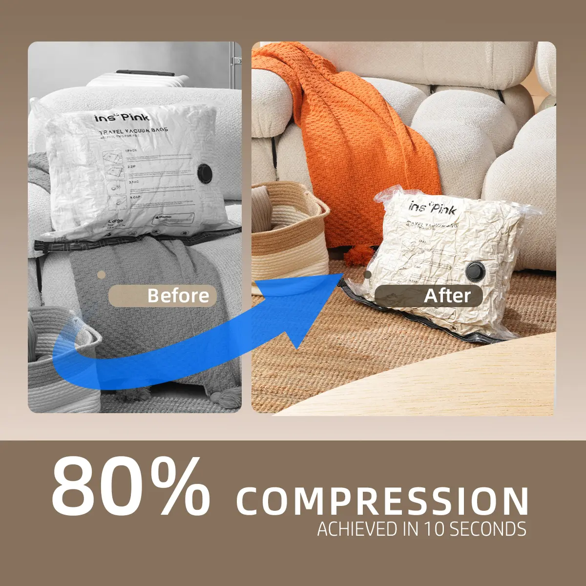 Tired of bulky luggage or messy closets? The Inspink Travel Vacuum Storage Bags Set is your ultimate space-saving solution. With an up to 80% compression rate, these bags dramatically reduce the volume of clothes, bedding, and seasonal items. Choose from sets of 24, 15, or 9 bags, complete with zipper pouch organizers, and experience lightweight travel and clutter-free storage.