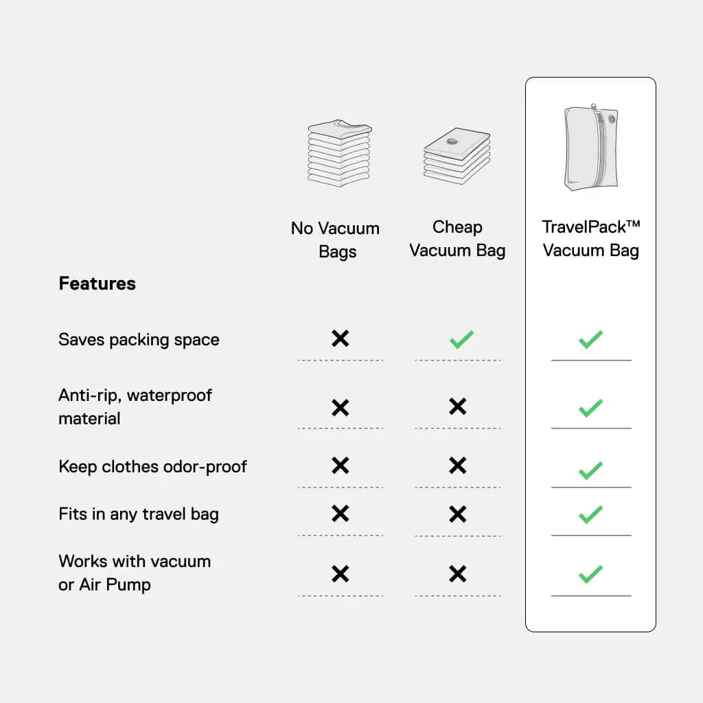 Our TravelPack Vacuum bags arrived half an hour before we left home for a month. We were already packed but decided to quickly repack and that was the best decision we made. We were able to take everything we needed and it was much easier to pack our bags, even bringing home the limited souvenirs we picked up along the way. Can’t recommend these Vacuum bags enough.