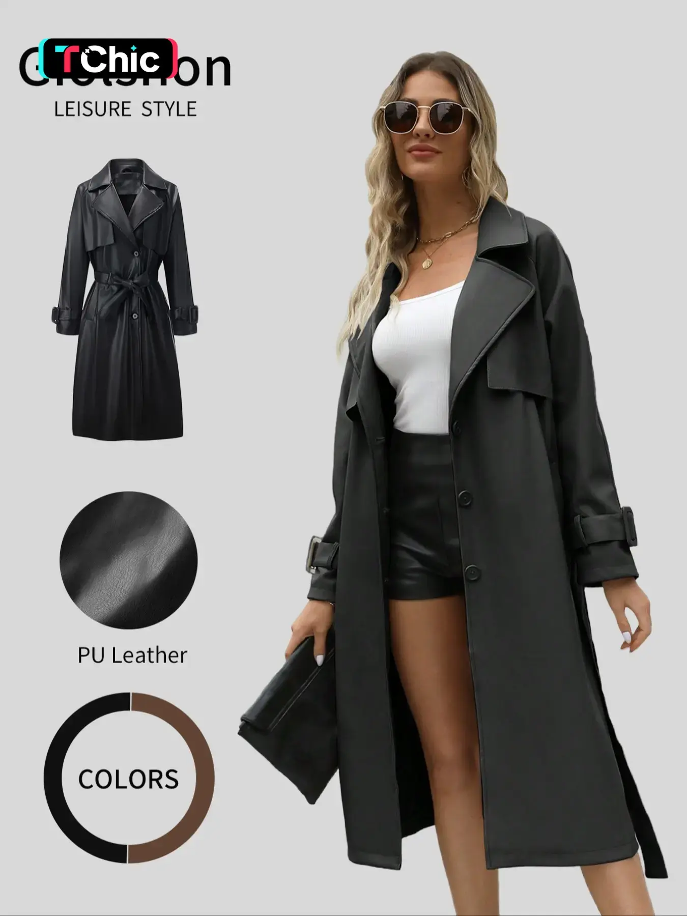 Women's Spring British Style PU Long Jacket, Casual Fitted Windbreaker, Lightweight Elegant Commuter Coat, Includes Waistband
