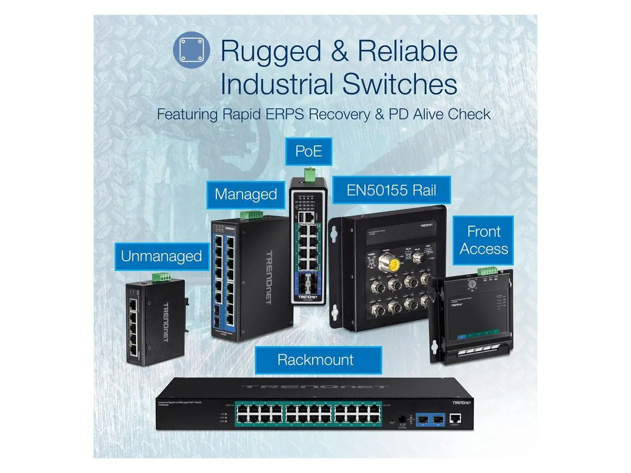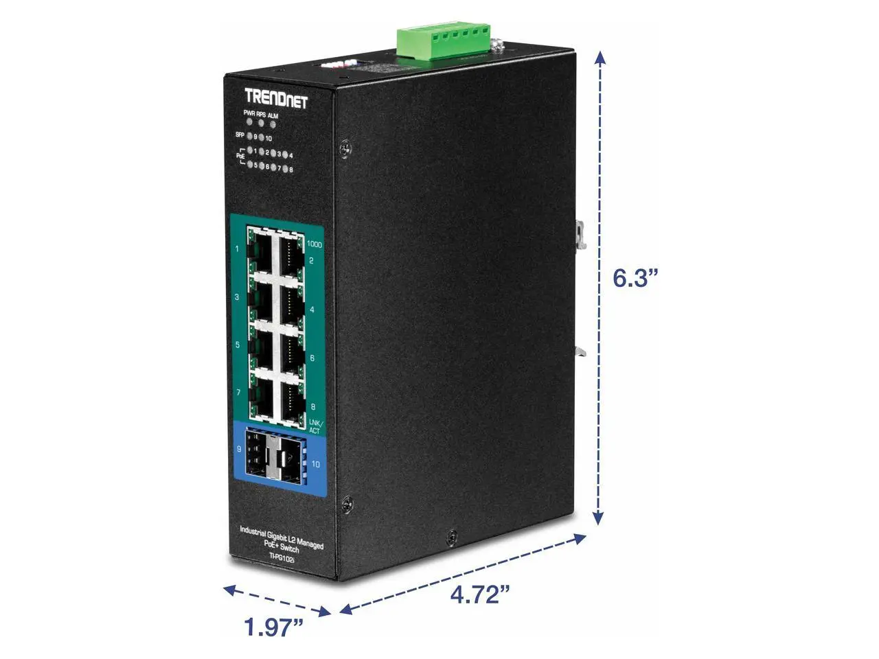 TRENDnet's 10-Port Industrial Gigabit L2 Managed PoE+ DIN-Rail Switch, model TI-PG102i, features eight Gigabit PoE+ ports with a 240W PoE budget, and includes two SFP slots that support both 100Base-FX and 1000Base-FX modules for long distance fiber applications. The hardened switch is equipped with an IP30 rated metal enclosure, designed to withstand a high degree of vibration and shock, while operating within a wide temperature range of -40 - 75 C (-40 - 167 F) for industrial environments. Advanced traffic management controls, troubleshooting, and SNMP monitoring support make this a powerful solution for SMB networks. PoE Power A 240W PoE power budget supplies up to eight Power over Ethernet devices, and includes advanced PoE port controls such as enabling / disabling PoE, power priority, PD alive check, and power scheduling. Integr...Total Number of Network Ports: 8Modular: YesPort/Expansion Slot Details: 8 x Gigabit Ethernet NetworkPort/Expansion Slot Details: 2 x Gigabit Ethernet Expansion SlotMedia Type Supported: Twisted PairMedia Type Supported: Optical FiberEthernet Technology: Gigabit EthernetNetwork Technology: 1000Base-TNetwork Technology: 100/1000Base-FXNumber of Total Expansion Slots: 2Expansion Slot Type: SFPNumber of SFP Slots: 2Layer Supported: 2Manageable: YesPower Source: Power SupplyForm Factor: DIN Rail MountableHeight: 2Width: 4.7"Length: 6.3"Weight (Approximate): 2.05 lbTAA Compliant: Yes"