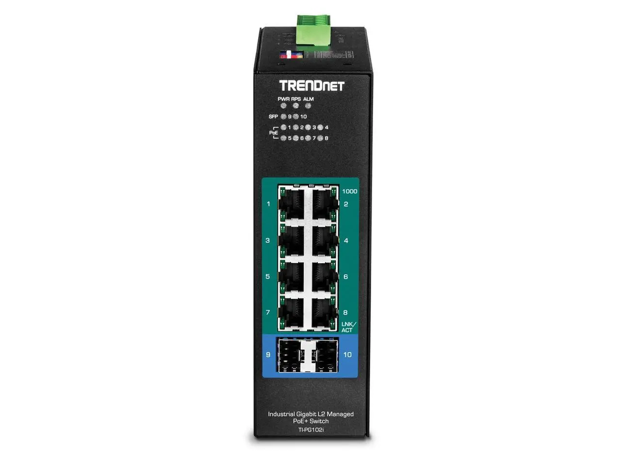 TRENDnet 10-Port Industrial Gigabit L2 Managed PoE+ DIN-Rail Switch, 8 x Gigabit PoE+ Ports, DIN-Rail Mount, 2 x SFP Slots, 24-57V DC Power Input, IP30, VLAN, Black, TI-PG102i
