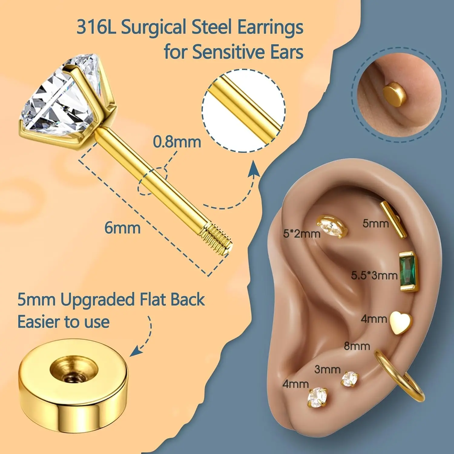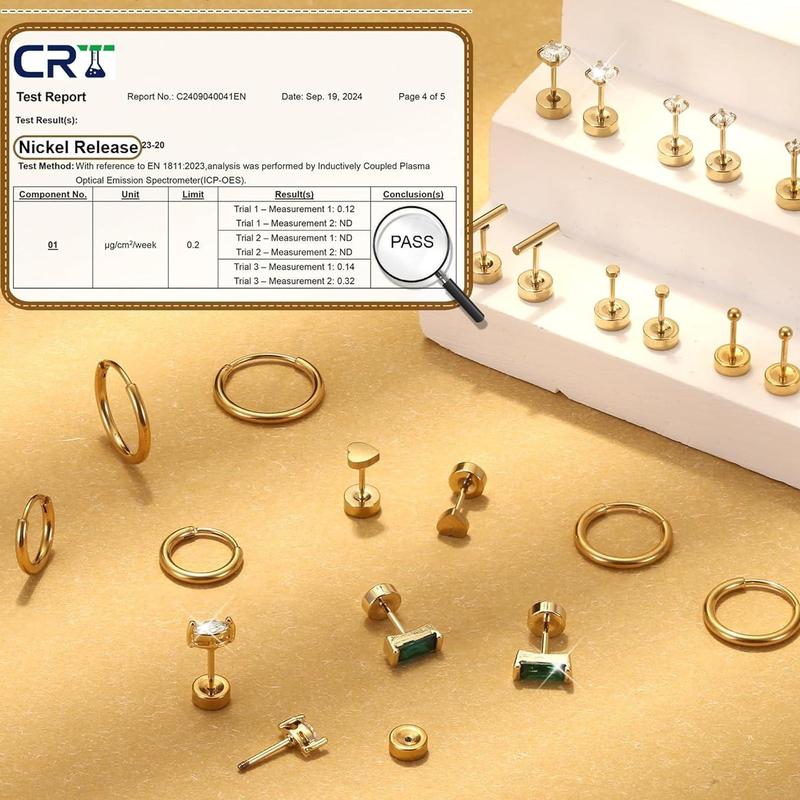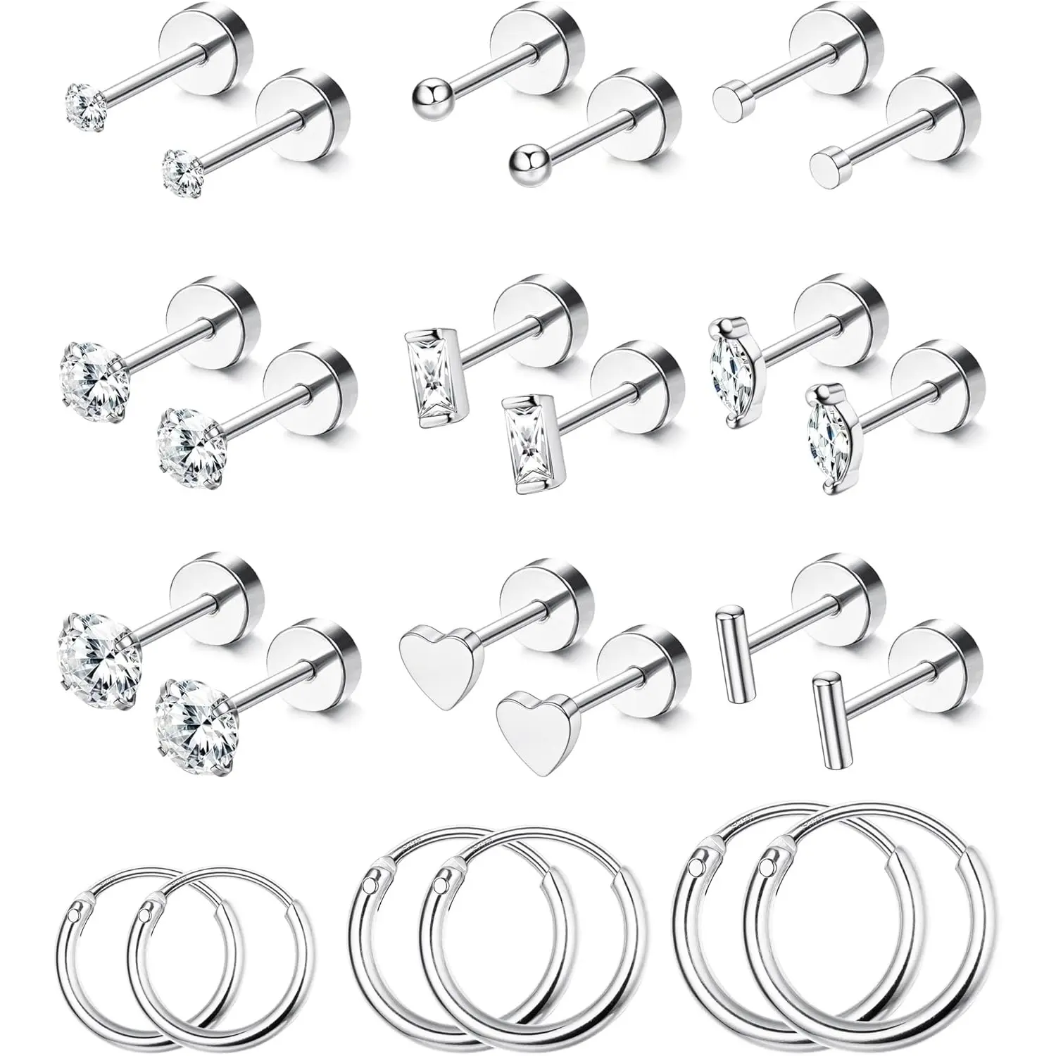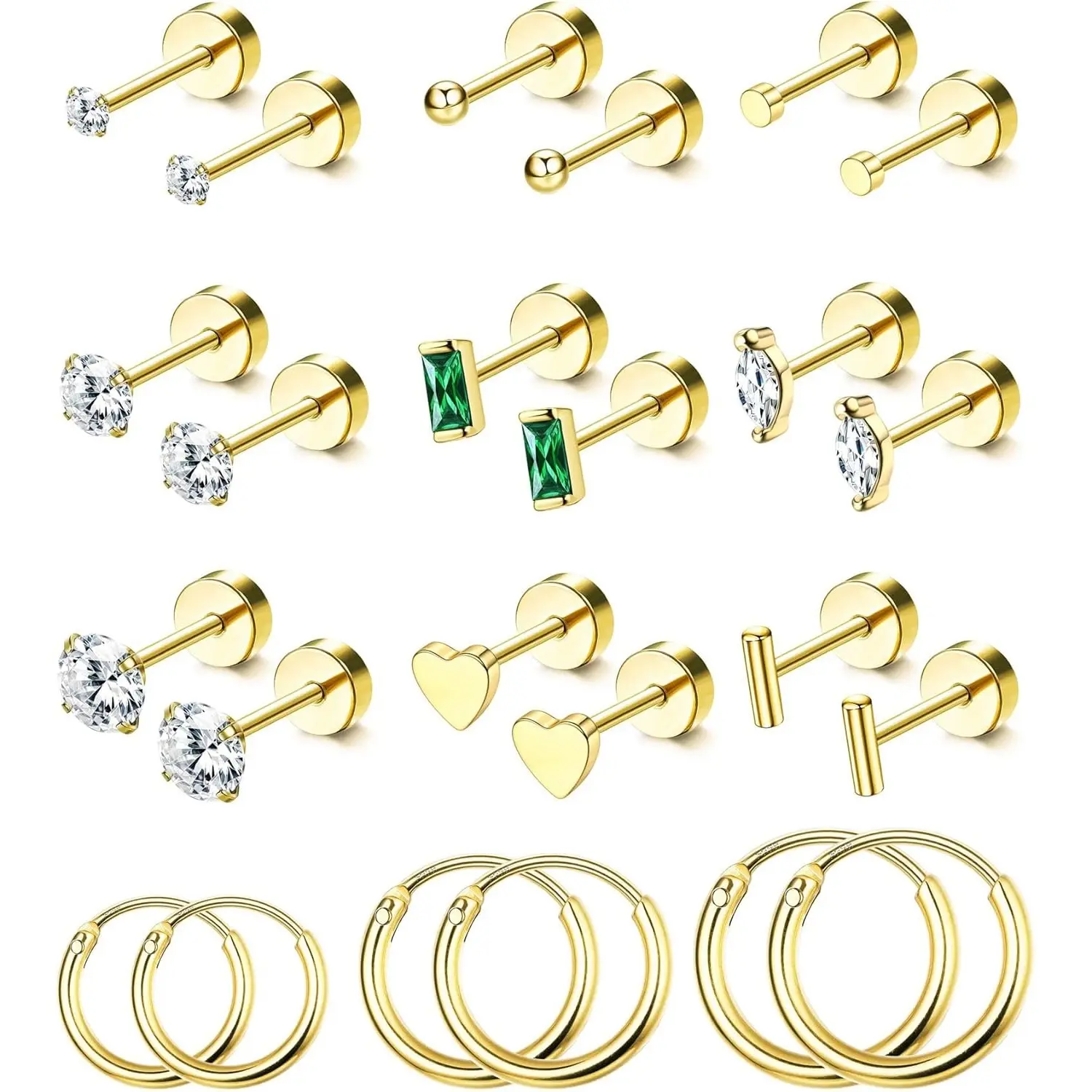 Gauge size:20G=0.8mm. 3 pairs round cubic zirconia flat back earrings studs(2mm,3mm,4mm). Ball&Round disc flatback stud earrings(2mm). Oval white cz(5*4mm). Emerald Green stud Earrings(6*3mm). Heart flatback earring(4mm). Bar screw back earring(5mm). 3 pairs small hoop earrings: 6mm,8mm,10mm.