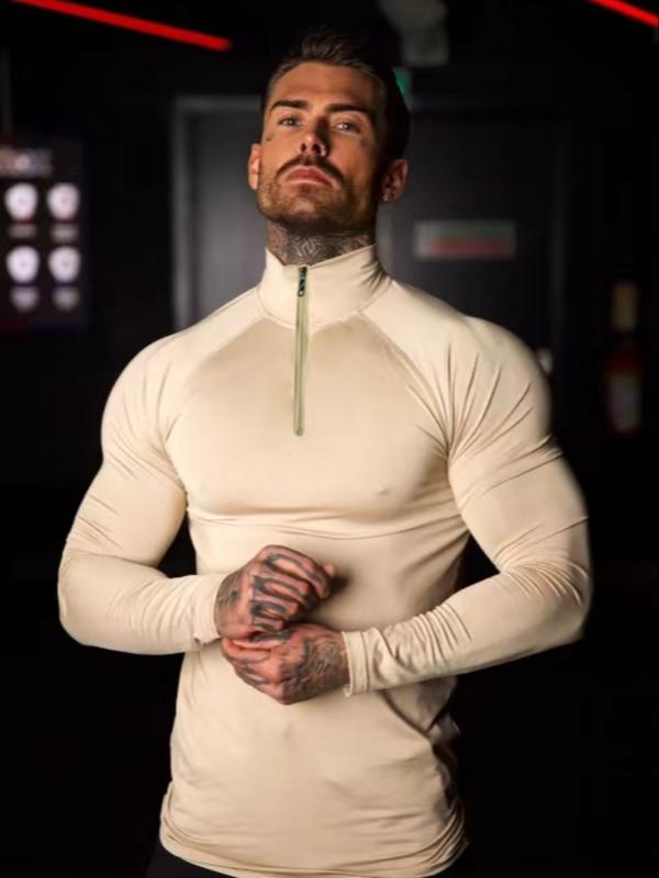 Trendy Beige Half - Zip Gym Shirt, Men’s Long - Sleeve, Breathable Material, Suitable for CrossFit, HIIT & Casual Athleisure #zipuphoodie #workoutwear #gymoutfits #womensactivewear #gymoutfitideas #athleisurewear #sportsshorts #mensjoggers #longsleevetee #activewearobsessed