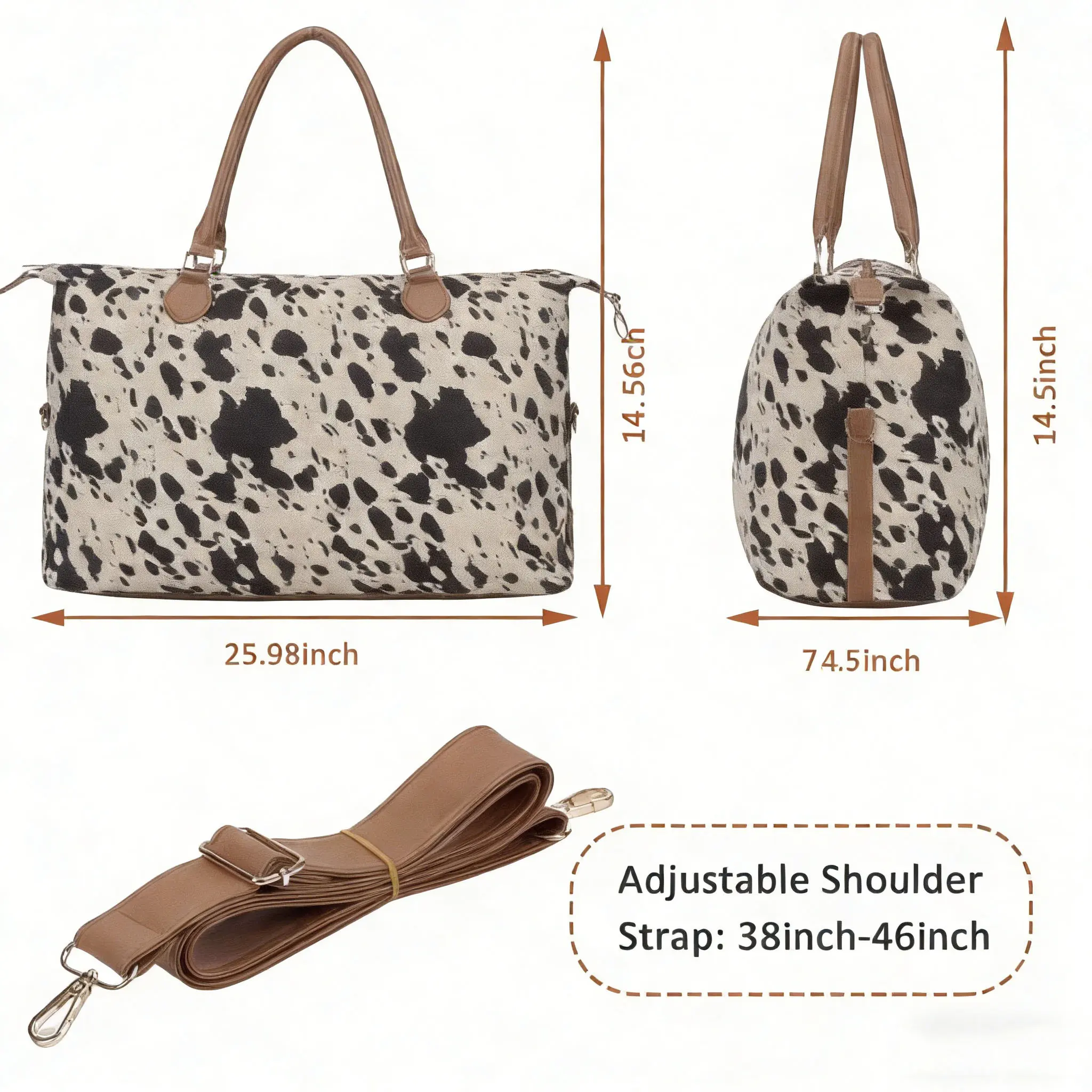 【Multiple Pockets & Adjustable Strap】Designed for convenience, this travel bag features multiple inner pockets: 2 open compartments for quick access and 1 hidden zip pocket for valuables like wallets or passports. The adjustable shoulder strap (38–46 in) and sturdy handles let you carry it comfortably your way.