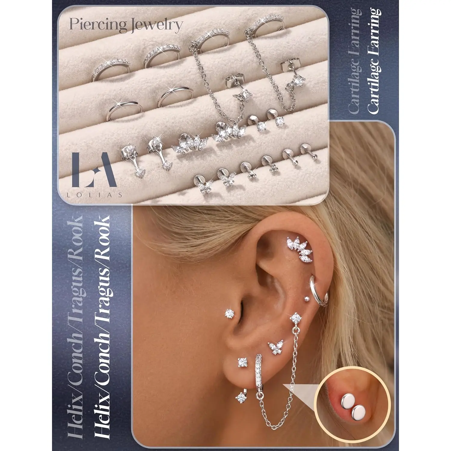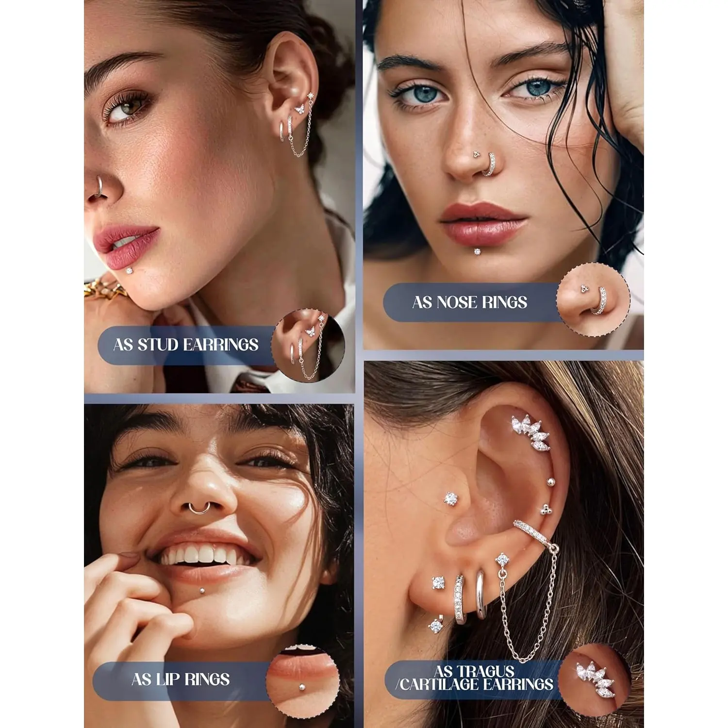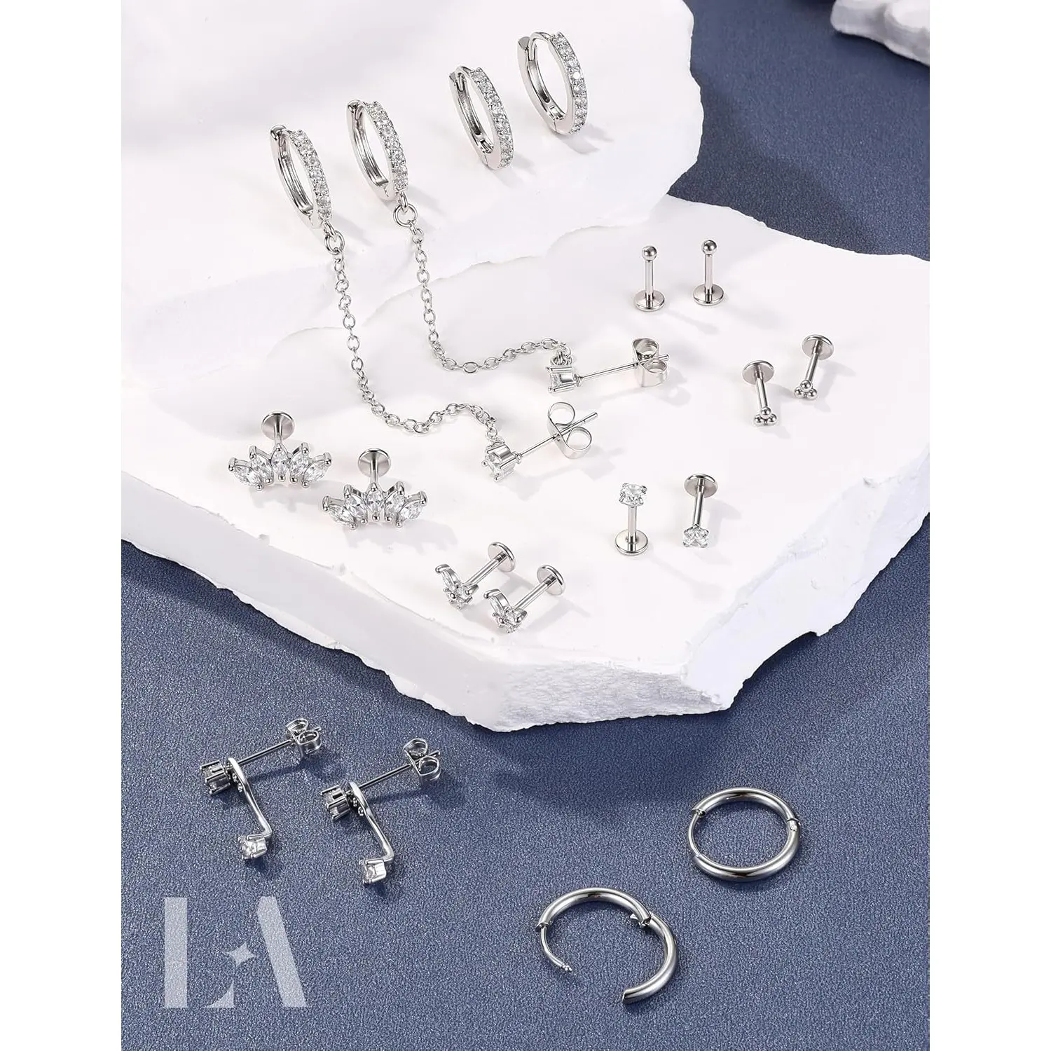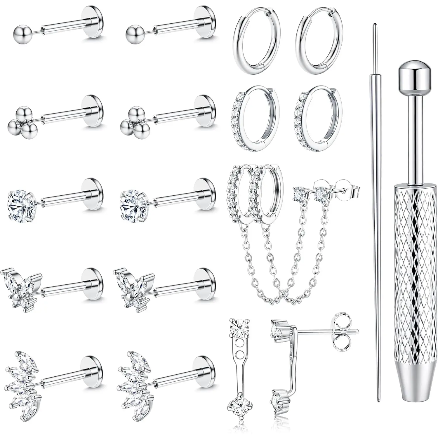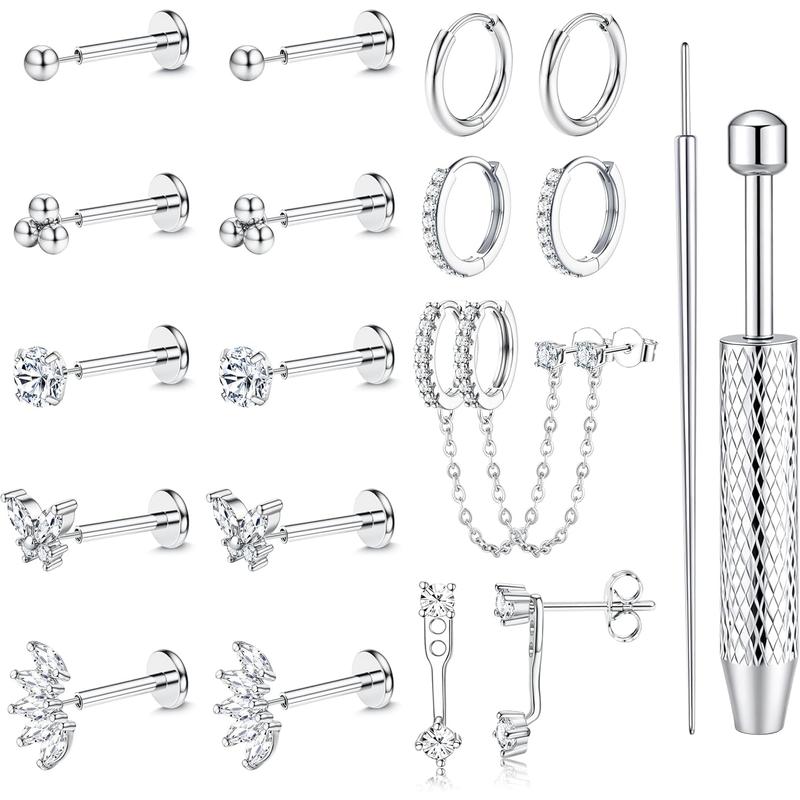 ·Earring Sets for Multiple Piercing: Stud gauge: 16G(1.2 mm)/ 18G(1.0 mm)/ 20G(0.8 mm) with a taper insertion of same size, bar length: 6 mm. Small hoop inner diameter: 10 mm. These cartilage piercing jewelry can be used as nose rings, helix piercing jewelry, tragus piercing jewelry, conch piercing jewelry and lip piercing jewelry. This set works seamlessly on common piercing sites. The mix of hoops and studs is made for stacking, you may also wear them alone to showcase a minimalist look.