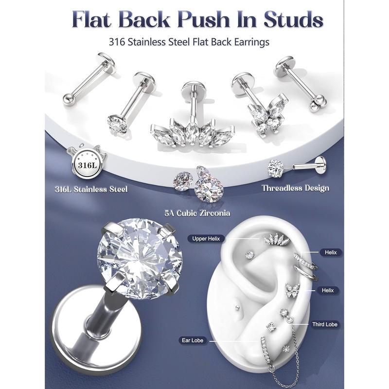 ·Threadless Flat Back Earring : Threadless flatback earrings for women feature a unique push in design for effortless wear. Unlike traditional threaded flat back stud earrings , these 14K gold plated earrings can be put on or taken off in seconds—no twisting needed. And the flexible pin allows you to easily bend it to avoid falling off. The lightweight nose stud with slim flat back ensures comfortable 24/7 wear.