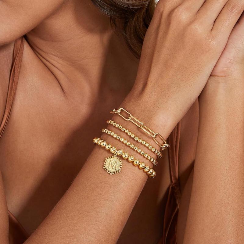 ·Gold Bracelet Stack: This 14k Gold Plated gold bracelet set for women features 4 unique styles: two 7.25" delicate 4mm beaded bracelets, one 7.25" bold 6mm beaded bracelet, and a modern 7.8" paperclip link chain. Designed to be worn together or mixed with your favorite pieces, This 14k Gold Plated gold bracelet stack adds dimension, shine, and charm to any outfit. One bracelet is adorned with an initial charm,a personal touch to represent your name, a loved one, or a meaningful word.