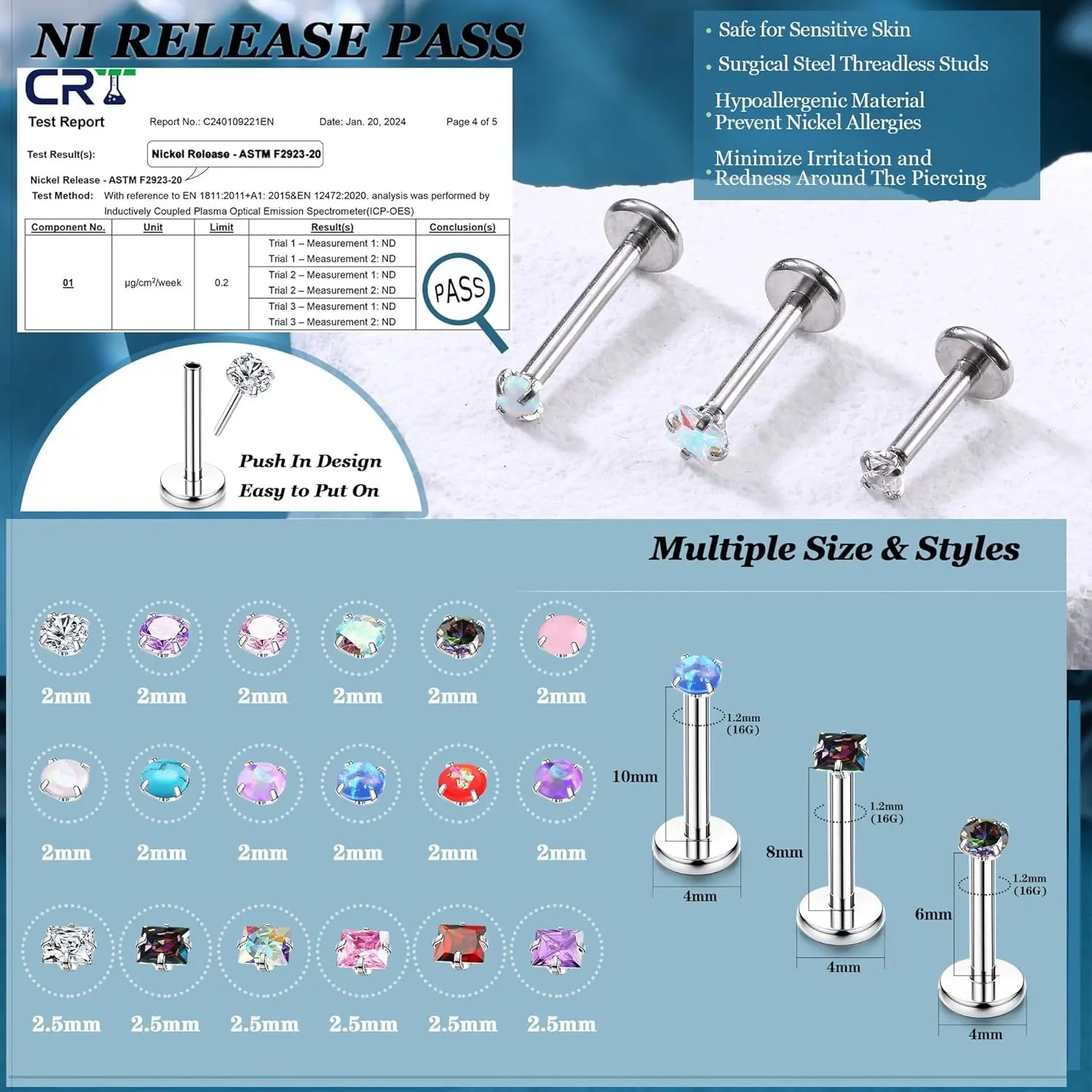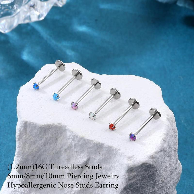 No More Worry About the Size--Gauge: 16G (1.2mm)/ 18G (1.0mm)/ 20G (0.8mm),Bar Length:6mm,8mm,10mm,Colorful CZ/Opal threadless nose studs with flat back,Clear CZ push in earrings. You can choose the right size according to your piercing
