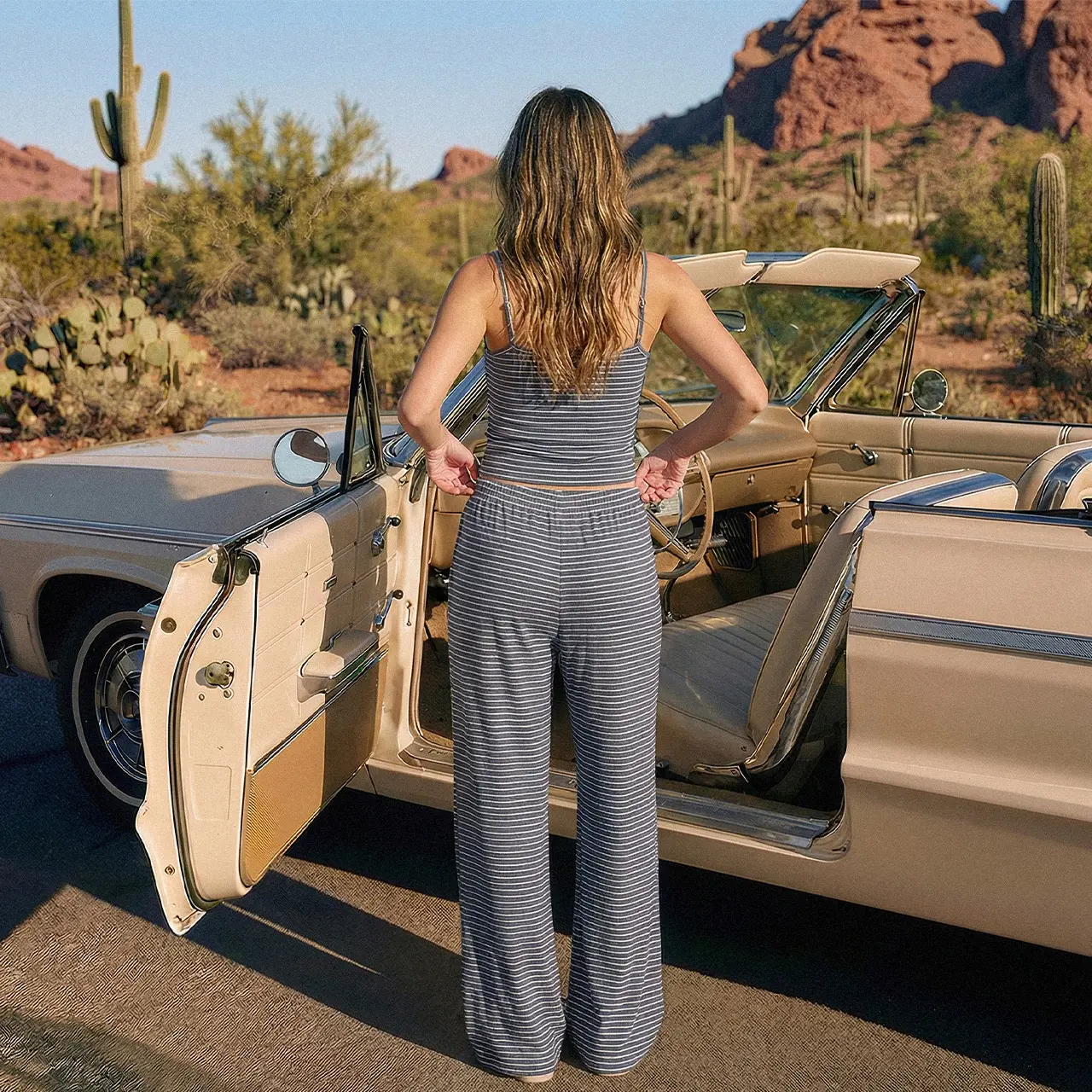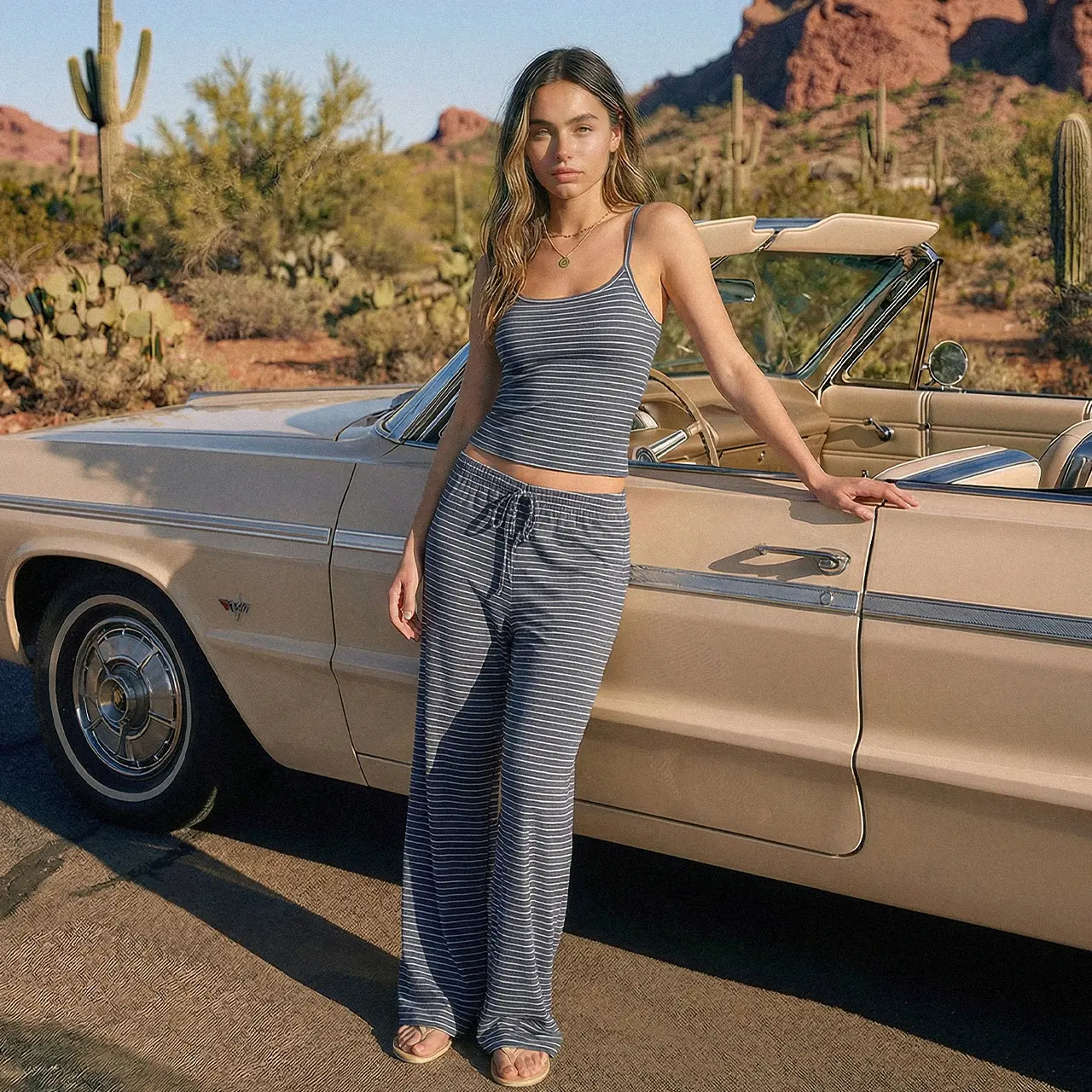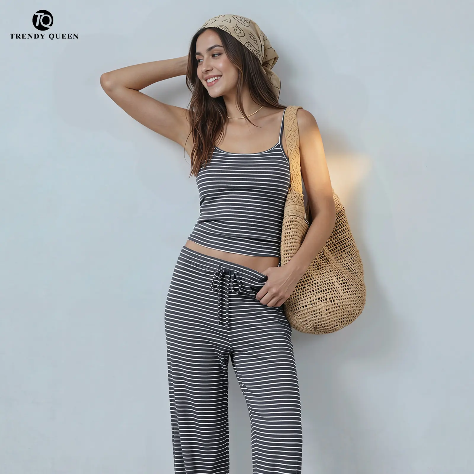 ·This 2-piece lounge set features a striped design, perfect for effortless chic. The set includes a top and matching pants, ideal for relaxation.