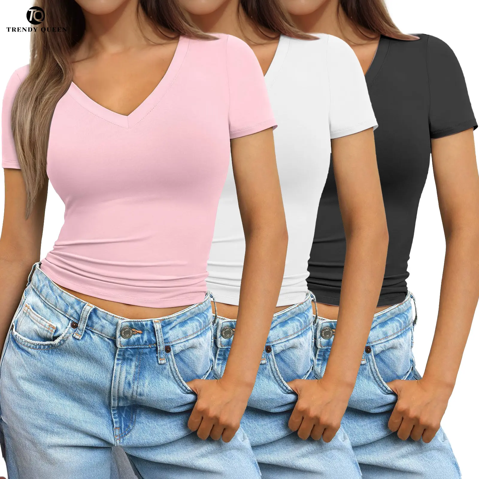 Trendy Queen Womens Deep V-Neck 3 PACK Backless Tops Short Sleeve Slim Fit T-Shirts Basic Y2K Tops Bustier Corset Cami 2025
