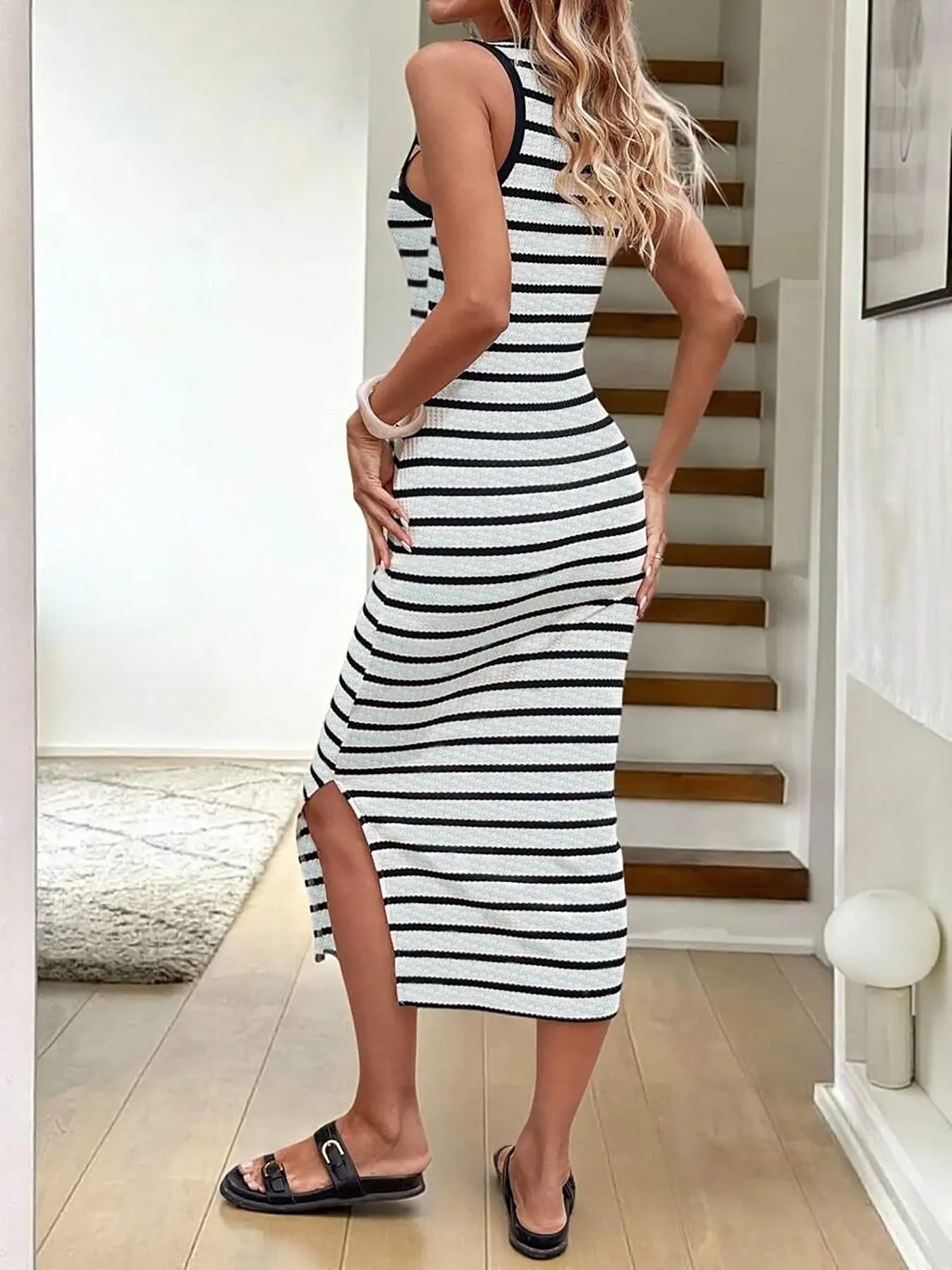 5. Trendy Striped Sleeveless Dress for Women, Slim Fit Casual Knit Round Neck Long Dress, Stylish Chic Color Block Design