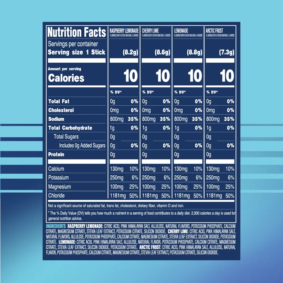 IngredientsAllulose,Calcium Citrate,Citric Acid,Magnesium Citrate,Natural Flavors,Pink Himalayan Salt,Potassium Citrate,Potassium Phosphate,Stevia Leaf Extract,Silicon Dioxide