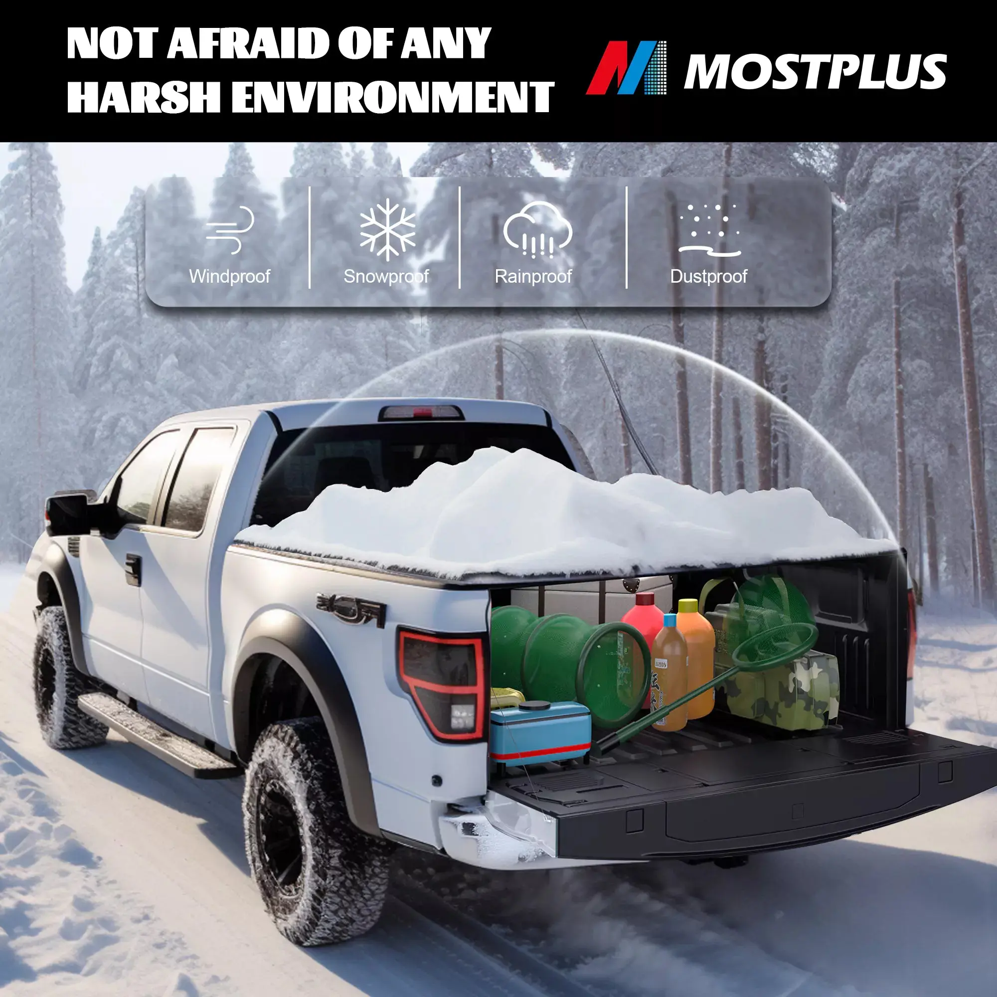 The cover is secured by quick-release clamps. Keeps your equipment inside your bed dry.