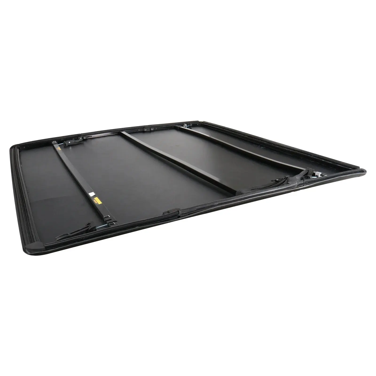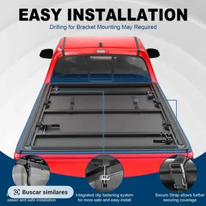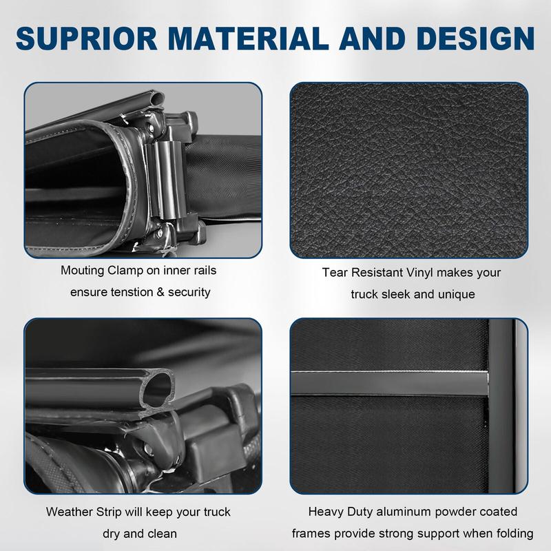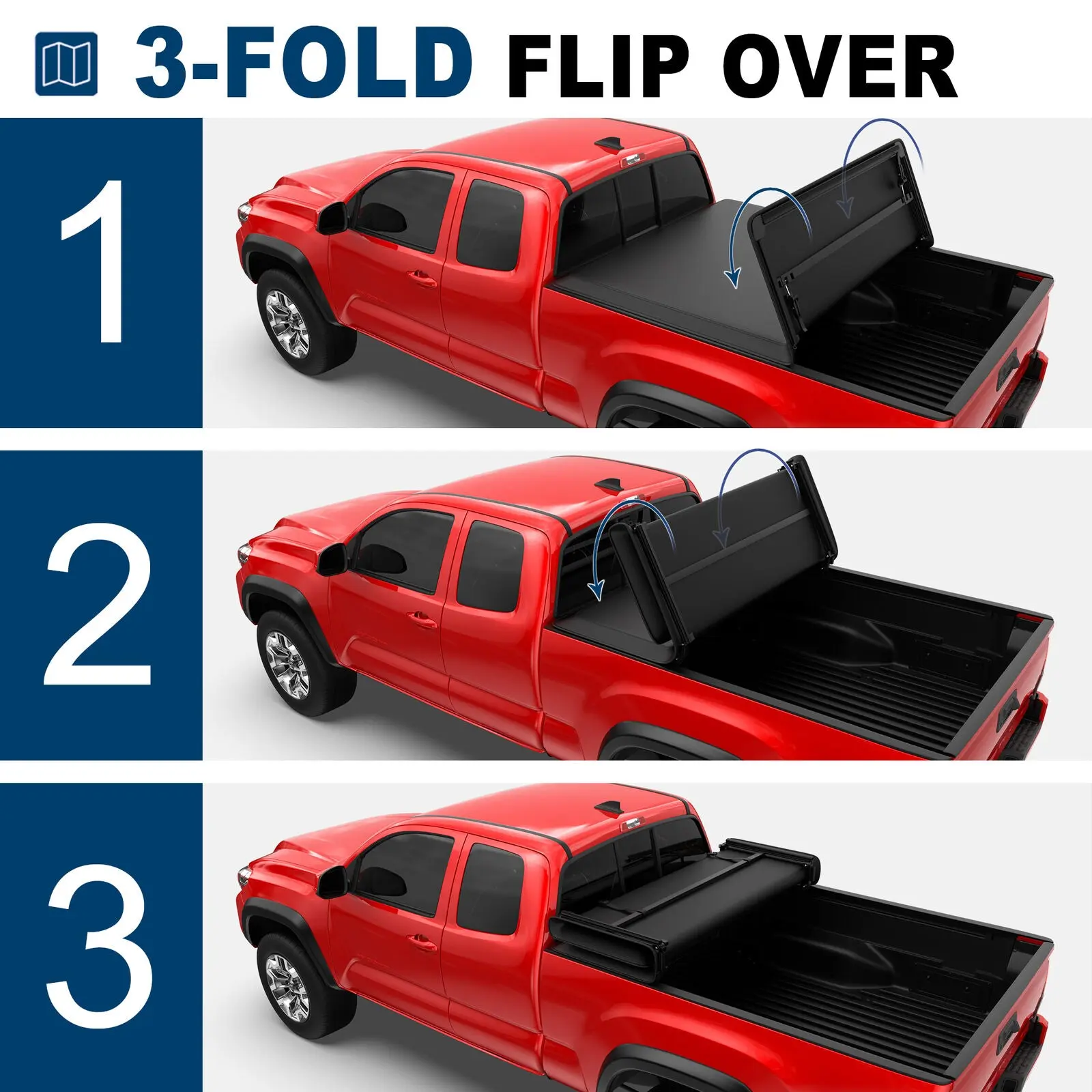 With durable tear-resistant vinyl and rustproof heavy-duty aluminum, the MOSTPLUS Tri-fold soft tonneau cover protects bed items from rain, snow, UV rays, and temperature changes, among other elements. It attaches to your bed with hand-tightened clamps, requiring no tools for installation. Allows 2/3 bed access when folded and removable in minutes. And nylon straps hold the cover in place while open for safe driving.