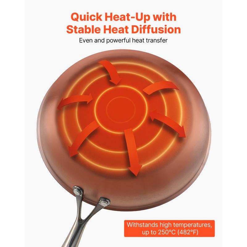 • Our frying pan set features triply-layer stainless steel with a polished surface. It provides even heat distribution and durability. The composite stainless steel surface resists scratches and warping, ideal for daily use. Trust in its long-lasting performance.