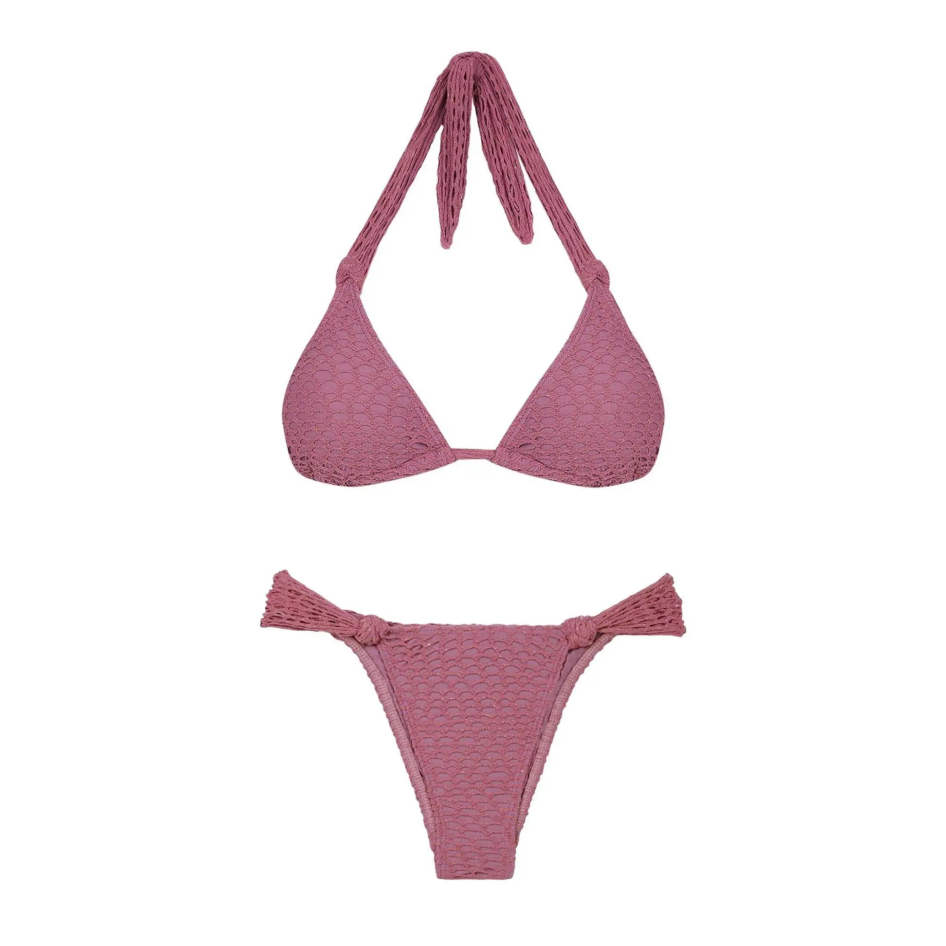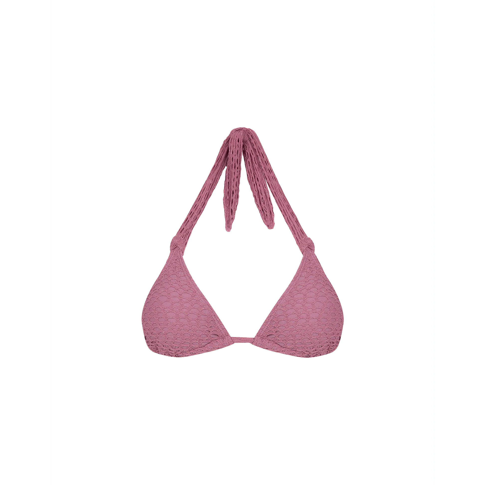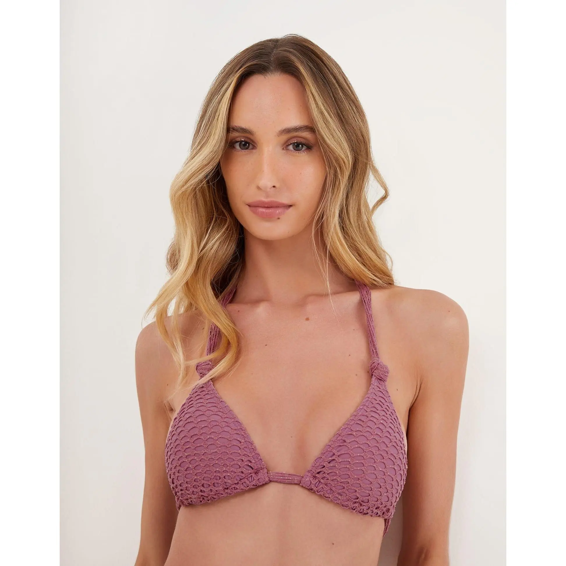 The ViX Lee Tri Top is a classic bikini style with a flattering V-neckline, featuring a mesh overlay with gold metallic threads throughout. It has dual knotted accents at front and adjustable tie closures at the back for a unique and customizable fit. Style the Lee Tri Top with a matching bottom and cover up for a vacation-ready look.Features: