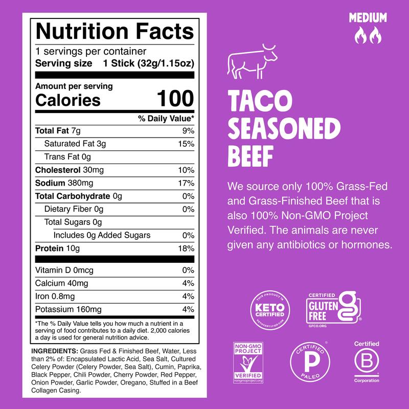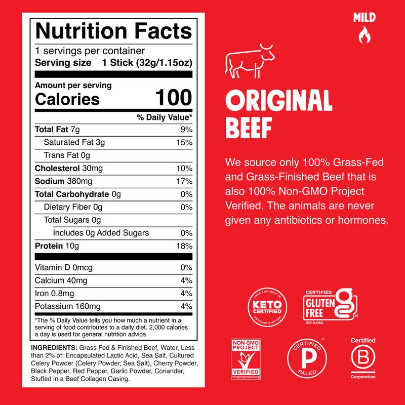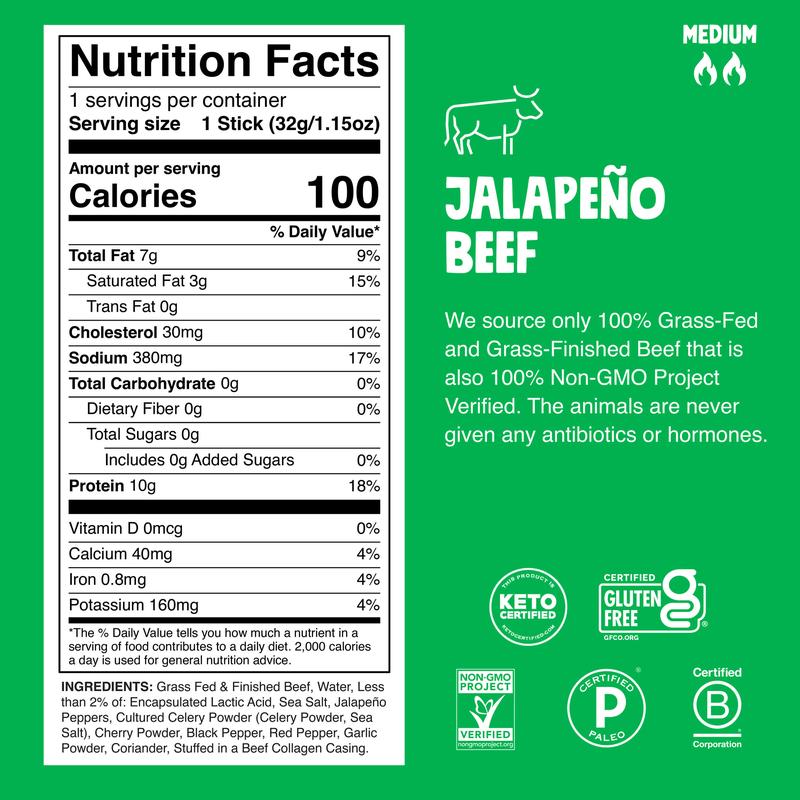 100% Grass Fed and Finished Beef Jalapeño Pepper Sea Salt Celery Black Pepper Red Pepper Garlic