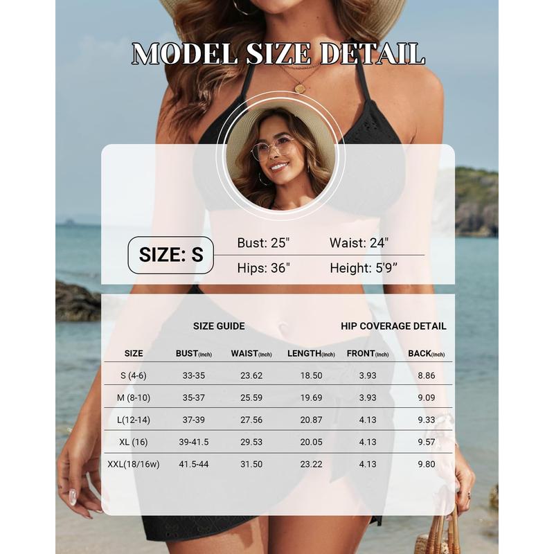 ·Three Piece Bikini Sets for Women: This stylish Three piece swimsuit features a triangle halter bikini top with adjustable ties, mid-waist bikini bottom, and an eyelet embroidery cover up, blending fashion and allure for a captivating beach look.