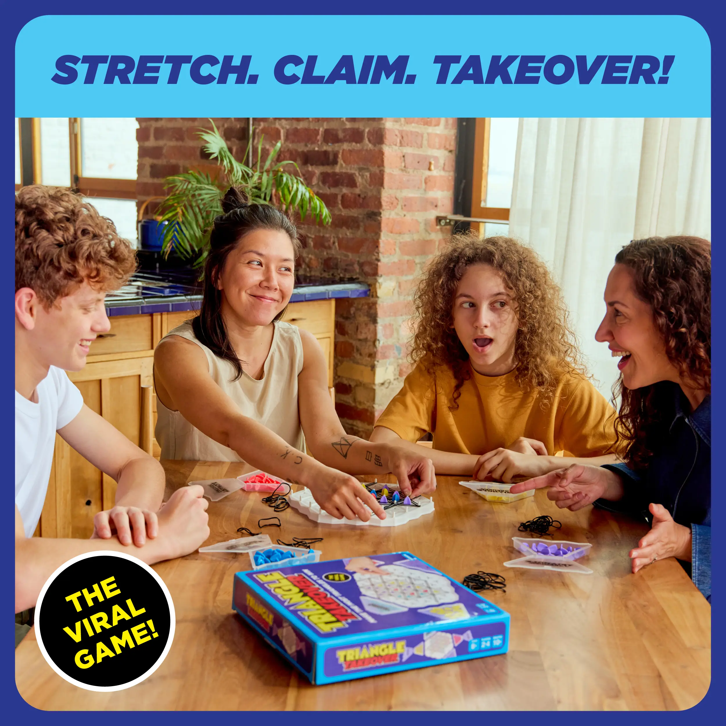 Stretch, snap, and claim your space! Triangle Takeover is the brain-boosting board game where players use rubber bands to build triangles and take over the board. Great for kids 8+, teens, and adults who love strategy and fun! Includes game board, 50+ bands, 84 pegs, 4 storage cases & instructions. Perfect for family game night, party games, or anytime fun. Easy to learn, hard to stop playing!