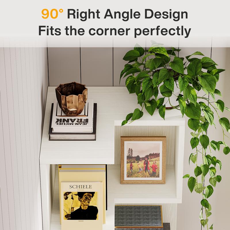 Space-Efficient: Tribesigns L-shaped corner bookshelf with drawers effectively uses corner space, maximizing storage without taking up extensive floor area. Measuring 19.68" D x 19.68" W x 66.92" H, it offers plenty of storage and display options