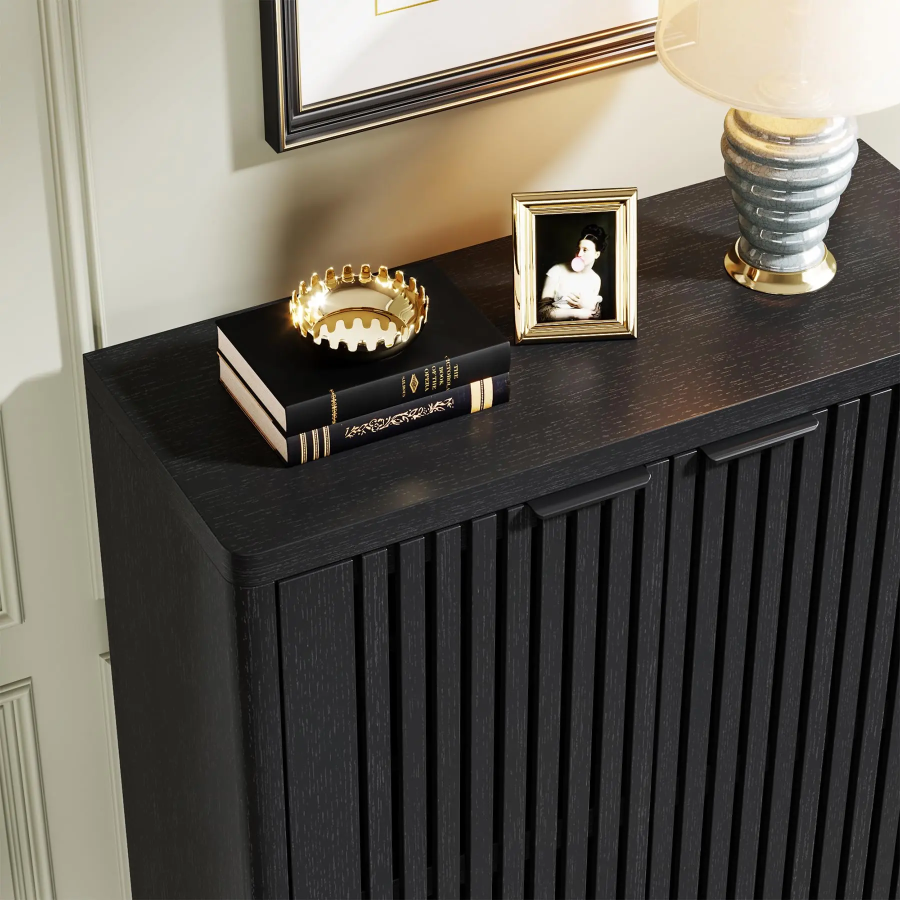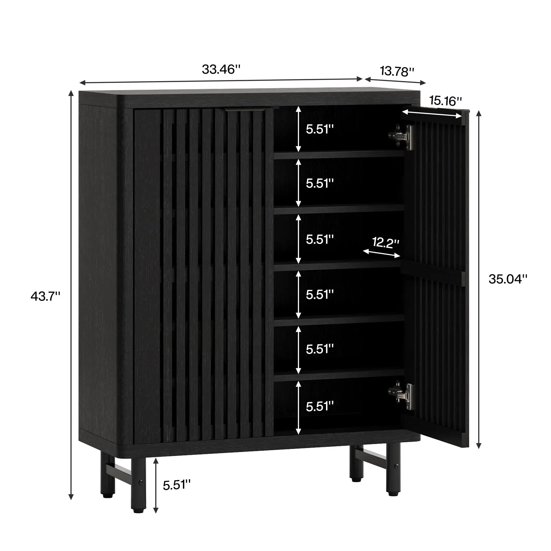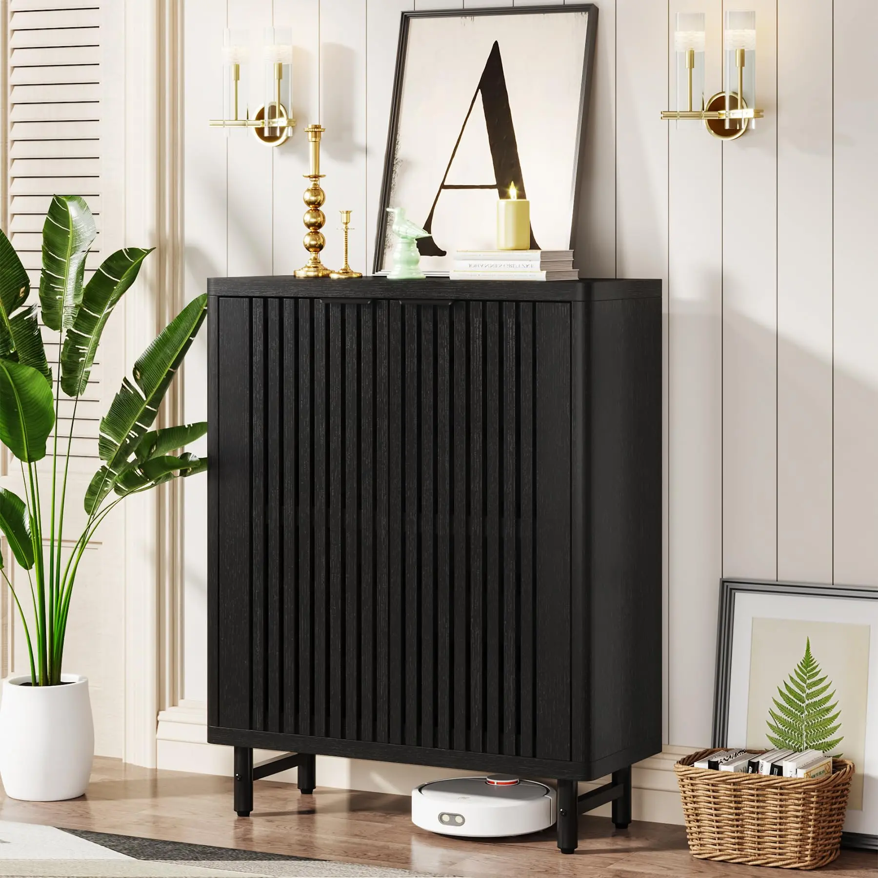 【Generous Storage Capacity】: Sized at 33.46" W x 13.78" D x 43.31" H, this shoe cabinet offers ample space. The wide countertop is fit for keeping keys, bags, and everyday items. An open lower shelf is perfect for house shoes and robot vacuum cleaners. Internally, it boasts six tiers of shelves with adjustable partitions for optimal space utilization.