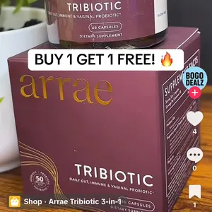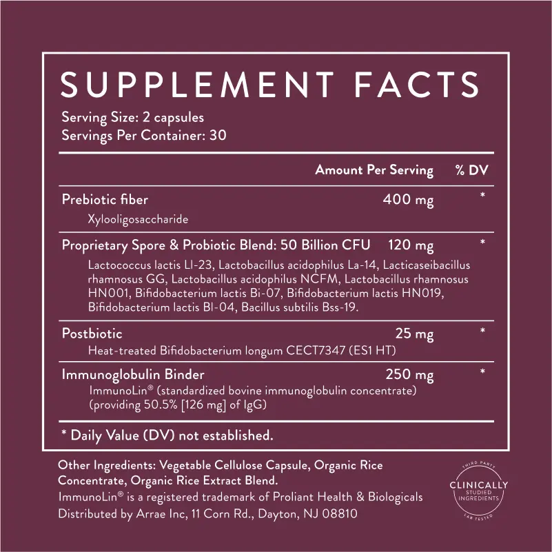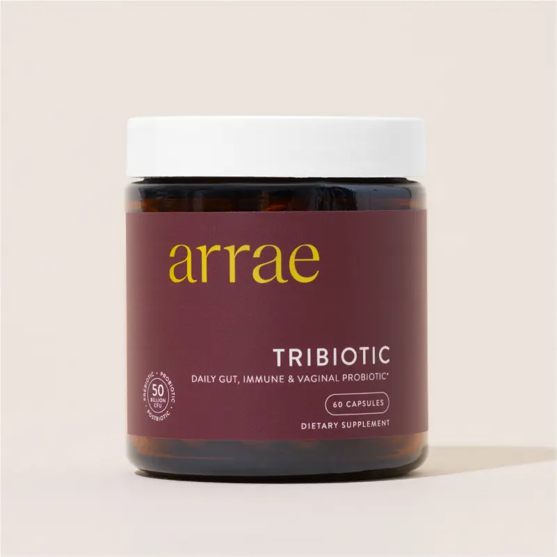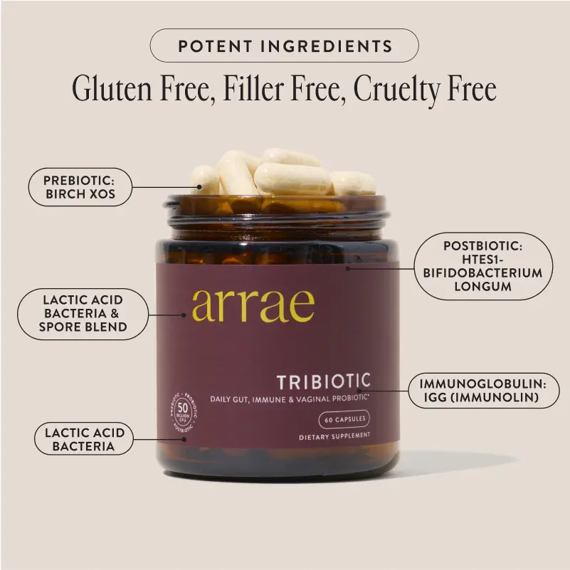 About Arrae Tribiotic: Arrae Tribiotic combines clinically-studied ingredients – a prebiotic, 8 probiotic strains (+ 1 spore), a postbiotic, and an immunoglobulin – for comprehensive microbiome support. Formulated for women, Tribiotic is designed to promote gut, immune, and women’s wellness.*