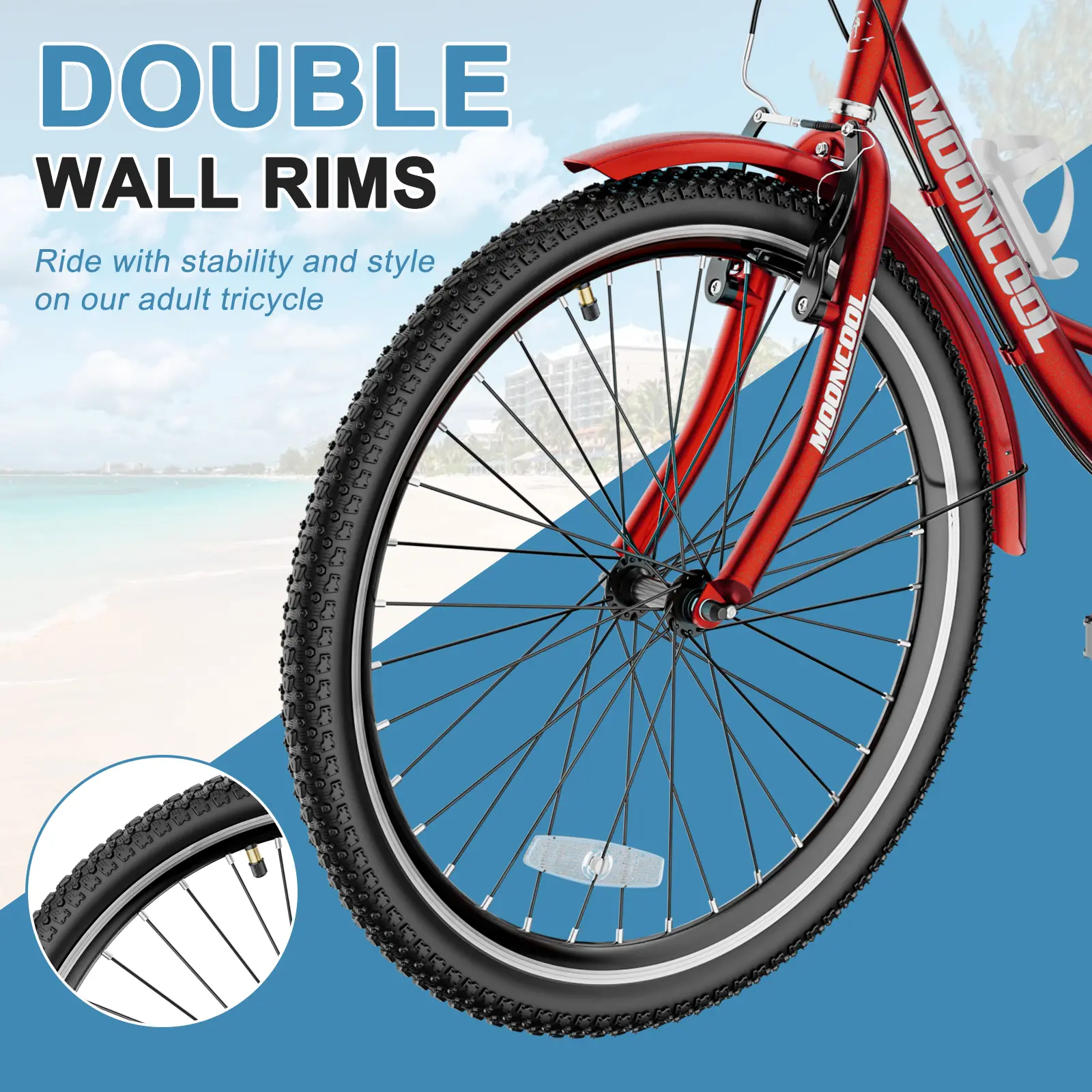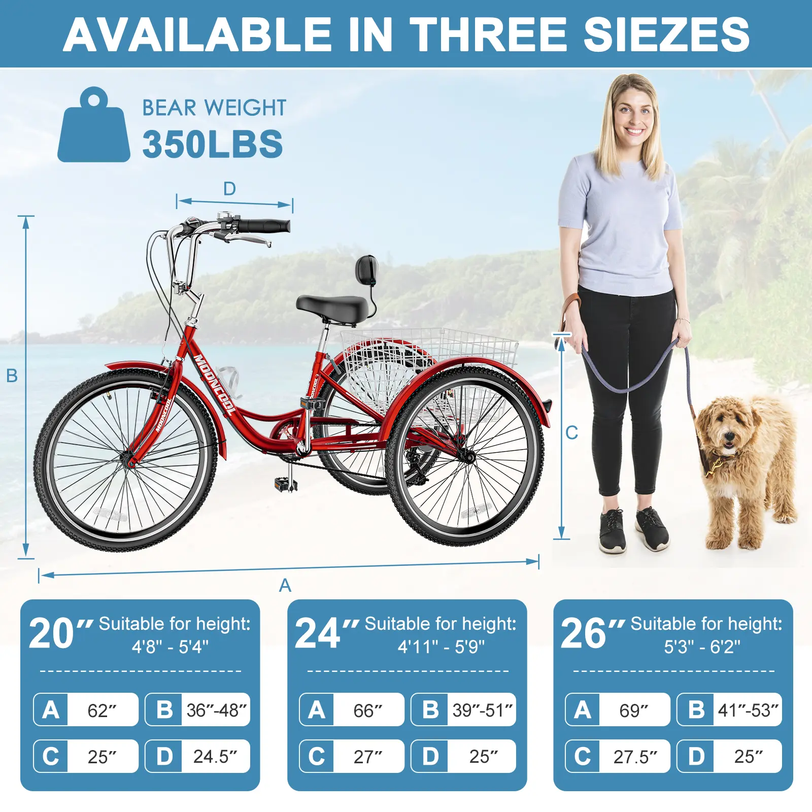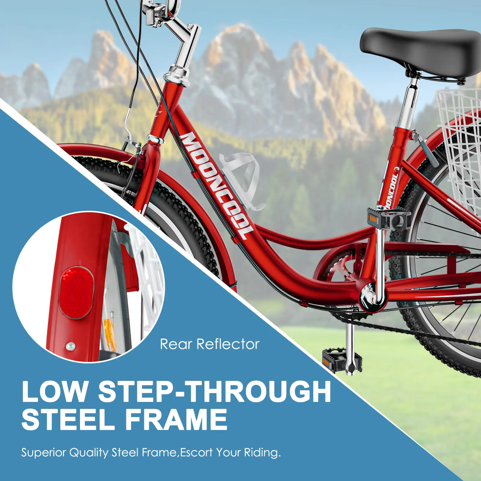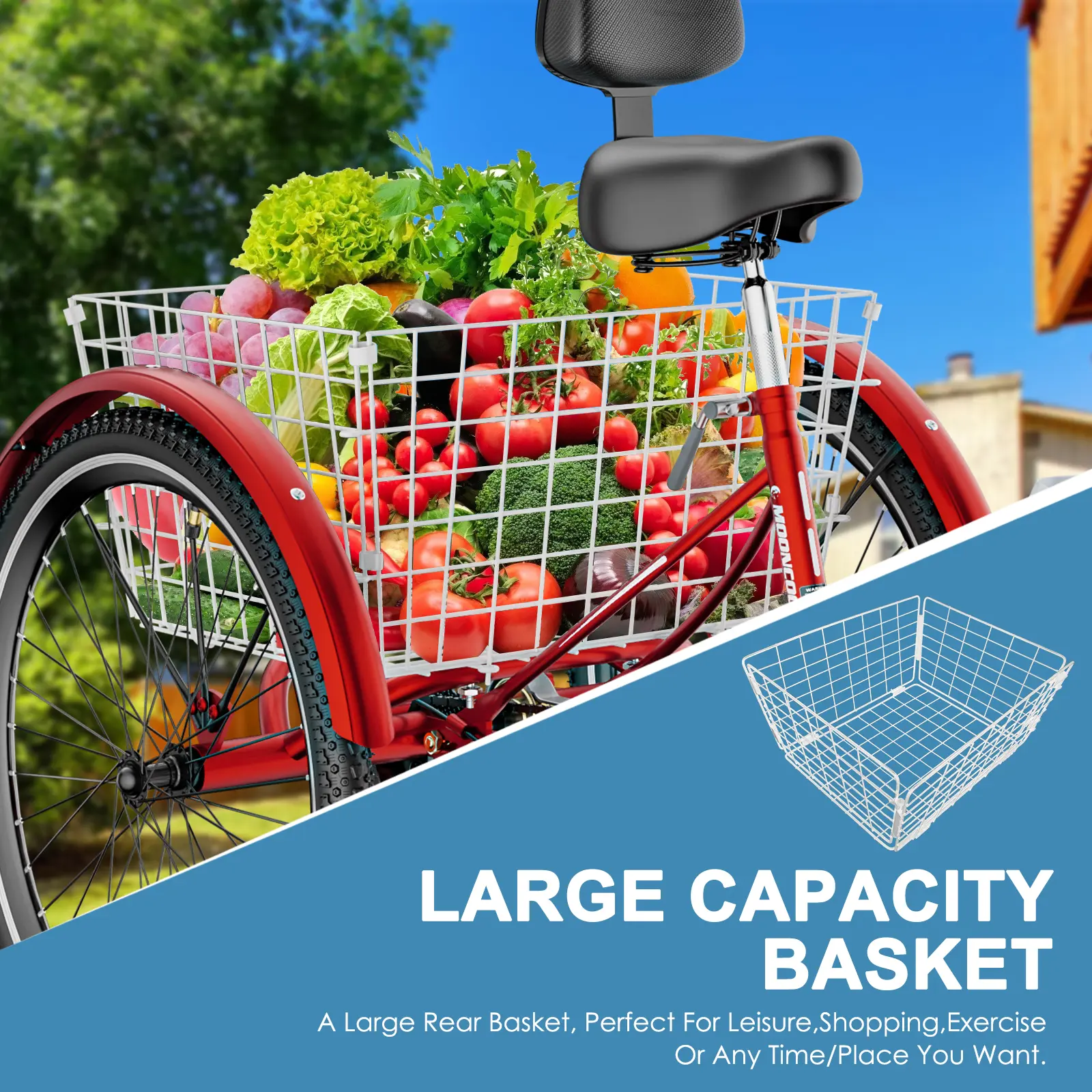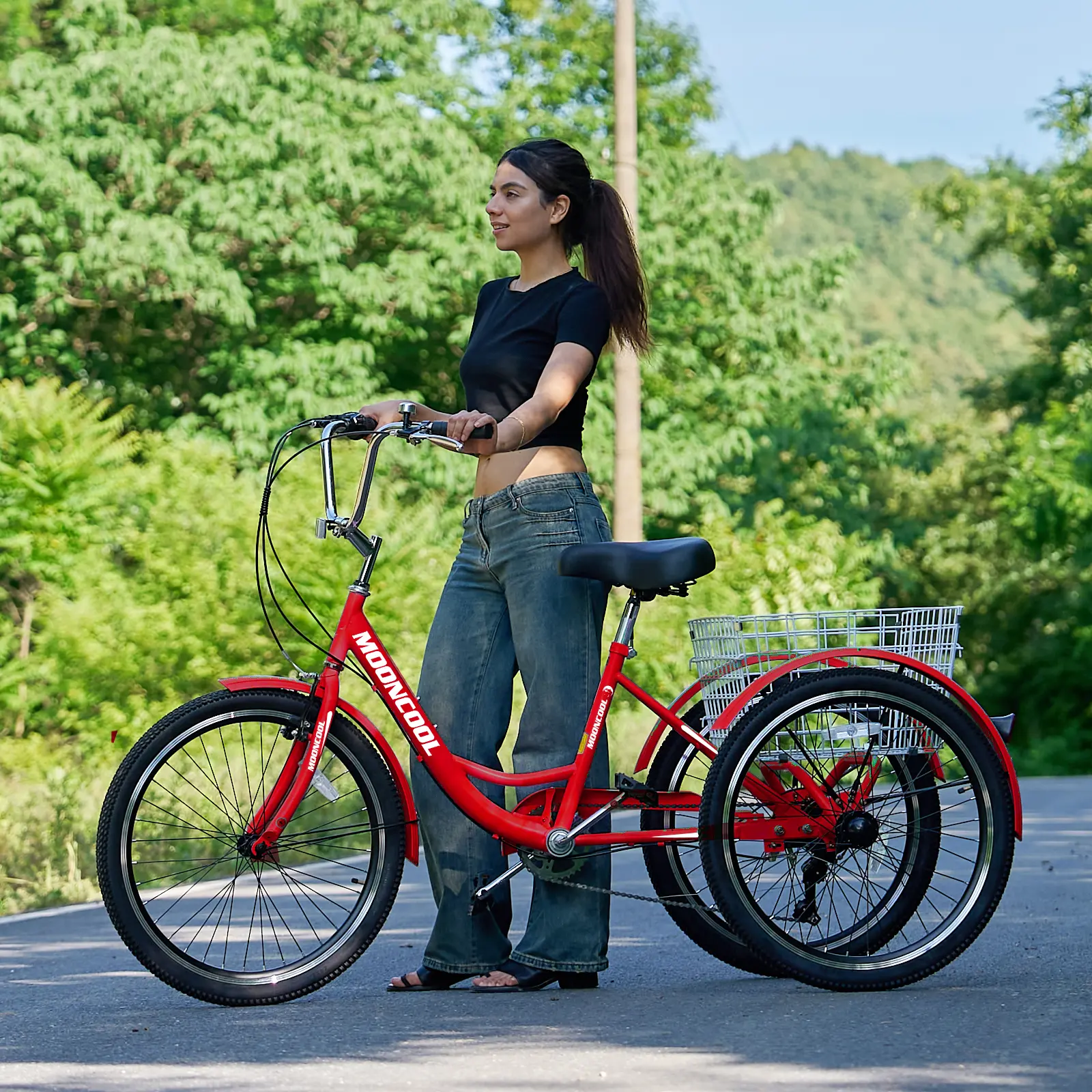 MOONCOOL tricycle has a large rear basket, load up the conveniently basket with petsοΌgroceries, supplies, or whatever suits your daily shopping while staying in shape. Perfect for ride the bike wherever you want to go, picnic, visit relatives and friends, or go out with your little puppy. You can ride safely and comfortably on town streets, beaches or bike lanes.