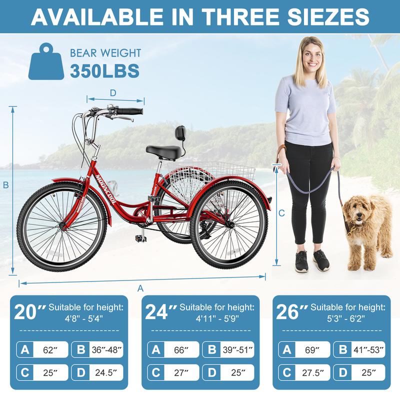 MOONCOOL Unisex adult tricycles are made of durable Carbon Steel,so that it can supports capacity up to 450 lbs.